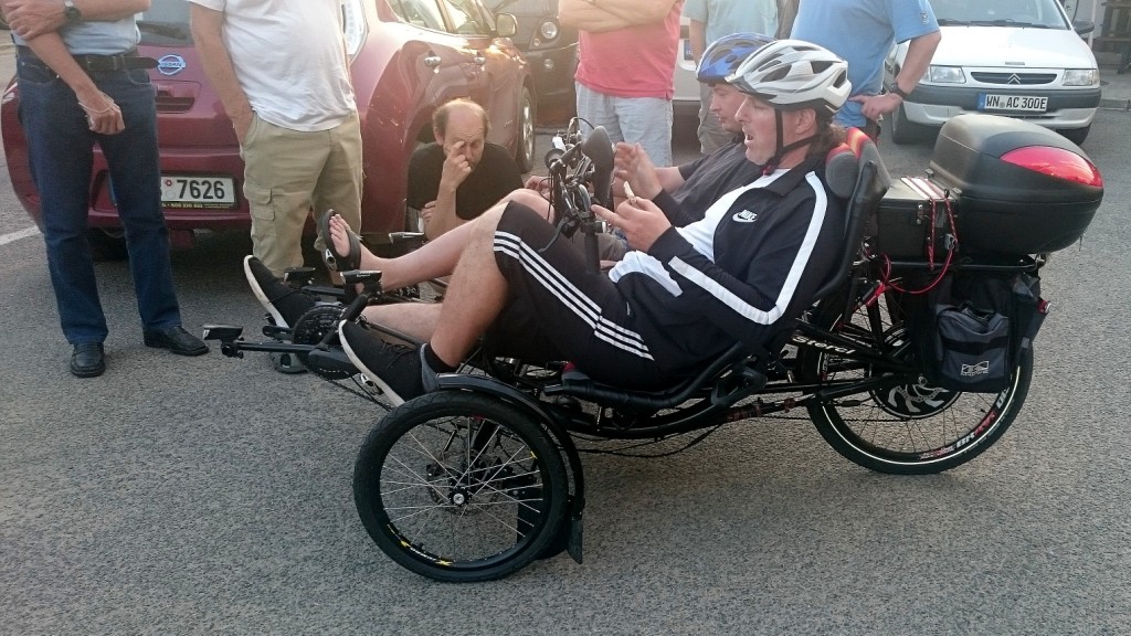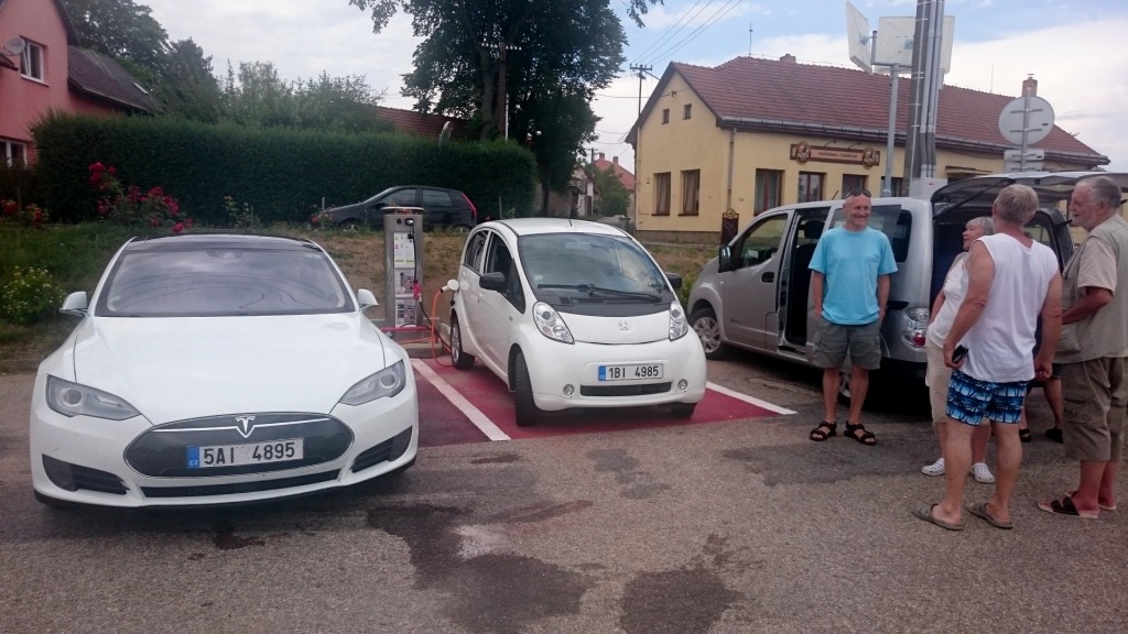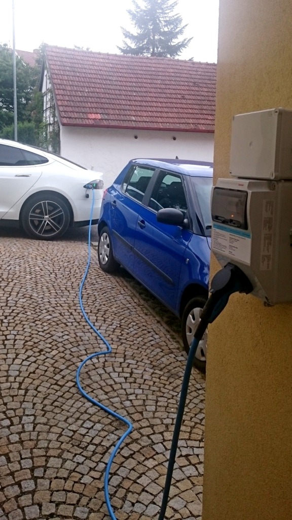 Ближе к полуночи человек 15 из нас во главе с 66-ти летним Яромиром (хотя был с нами коллега и постарше) поехали на традиционное ночное купание . Спать разошлись наверное часа в два ночи . Утром после импровизированного завтрака и чая-кофе народ начал постепенно разъезжаться, но часть из нас выехала ещё на небольшую прогулку . На трёх электромобилях мы поехали в два места проверить новые зарядки. Одна в городке Kamen , который находится на довольно оживлённой дороге , и сам примечателен интересным замком с парками и музеями. Зарядка там прямо у дороги на стоянке перед магазином . Когда мы припарковались перед ней подошла девушка , которая там работает и в её обязанности входит объяснять владельцам обычных автомобилей что не надо парковаться на места перед зарядной станцией- несмотря на все знаки и разметку такие случаи регулярны! Все электромобили были подключены к одному Меннекесу через тройник- каждому по фазе , зарядка выдала 22 кВатта. Интересно что зарядка в этой сети бесплатна , и включается Меннекес просто звонком на указанный там же номер телефона, автоматически. Там же и обычная розетка на 220 , которая подключена постоянно , для велосипедов и скутеров.