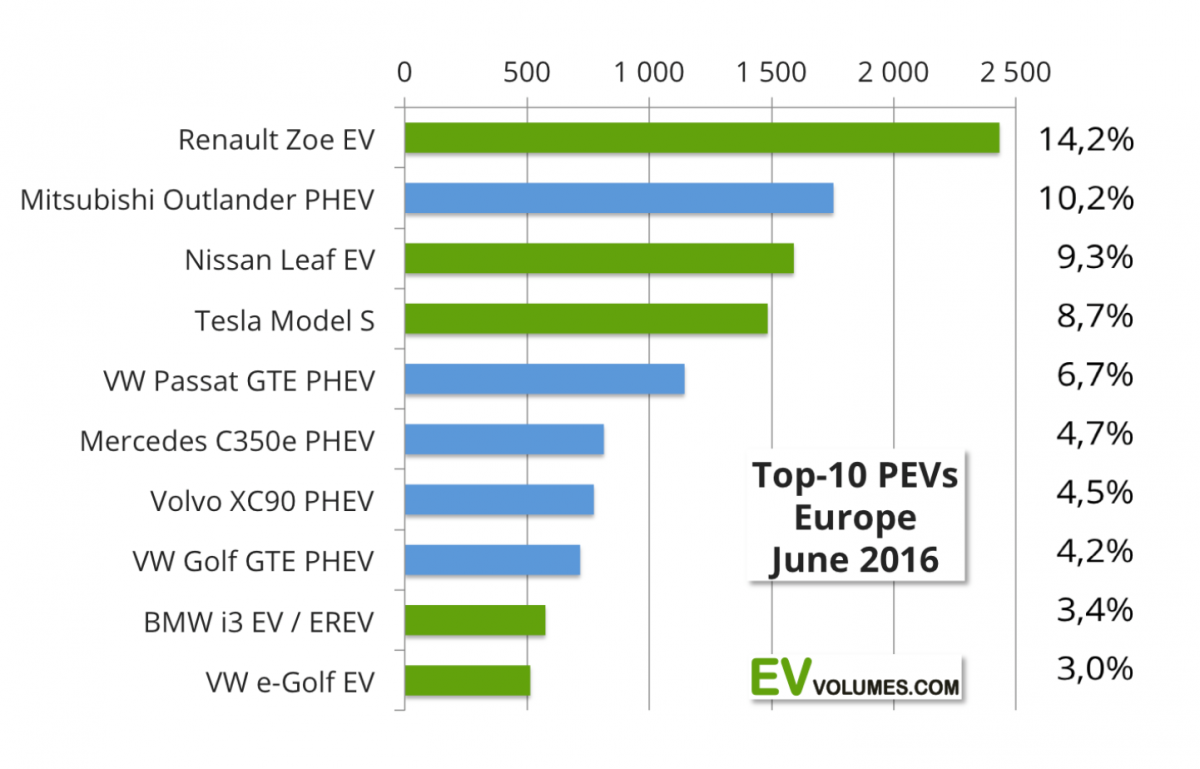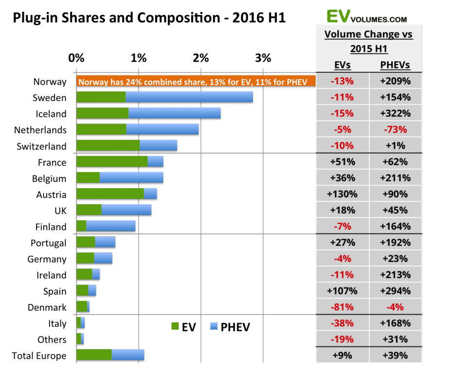 Европейский рынок следует тем же тенденциям, что и рынок Северной Америки. Даже рост примерно в тех же пределах - на уровне 21%. По июнь месяц продажи plug-ins составили 91,300 авто. Это на 17% больше всех проданных plug-ins в США за первые семь! месяцев 2016 года (77,834). Смещение продаж в сторону заряжающихся гибридов - общий тренд, которому следует и матушка Европа.