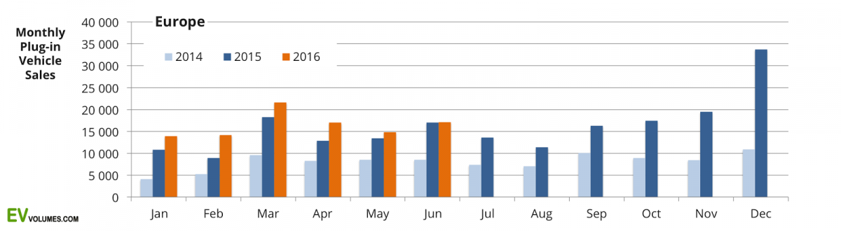 Европейский рынок следует тем же тенденциям, что и рынок Северной Америки. Даже рост примерно в тех же пределах - на уровне 21%. По июнь месяц продажи plug-ins составили 91,300 авто. Это на 17% больше всех проданных plug-ins в США за первые семь! месяцев 2016 года (77,834). Смещение продаж в сторону заряжающихся гибридов - общий тренд, которому следует и матушка Европа.
