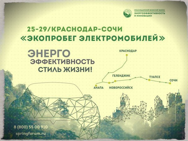С 25 по 29 мая пройдет автопробег электромобилей в Краснодарском крае. Данное событие будет проходить в рамках форума "Энергоэффективность и инновации". Старт будет в Краснодаре, а финиш в Сочи, автопробег будет проходить вдоль побережья черного моря от Анапы до самого Сочи. В городах маршрута будут совершаться остановки, в течение которых будут проводиться презентации электромобилей.