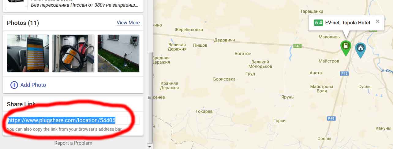 Прошу при указании мест зарядки давать ссылку на место карту зарядок plugshare.com. Причём оставлять только номер точки и обрамлять кавычками [plugshare]. Например, Вы хотите дать ссылку на первую клубную зарядку. Заходите на карту по ссылке https://www.plugshare.com/, находите нужную зарядку, щёлкаю по ней и слева нажимаете на кнопку "Сору link"