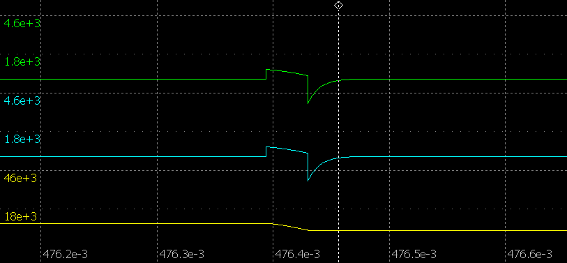У верхню сторону - струм біля 600 амперів та напруга біля 600 вольтів, і вниз сплеск - це качок контура зворотнього струму та напруги. 1500 ампер струму та 1500 вольт напруги. Тобто розрядник виключається.