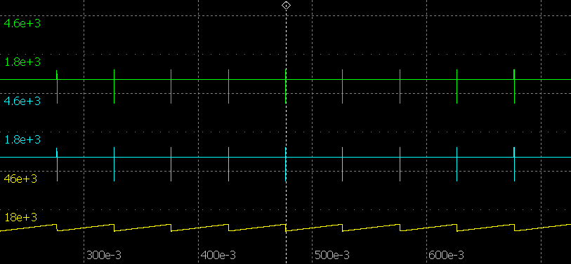 Це той же малюнок що і попередній тільки стиснутий щоби бачити скважність імпульсів та генерацію схеми.