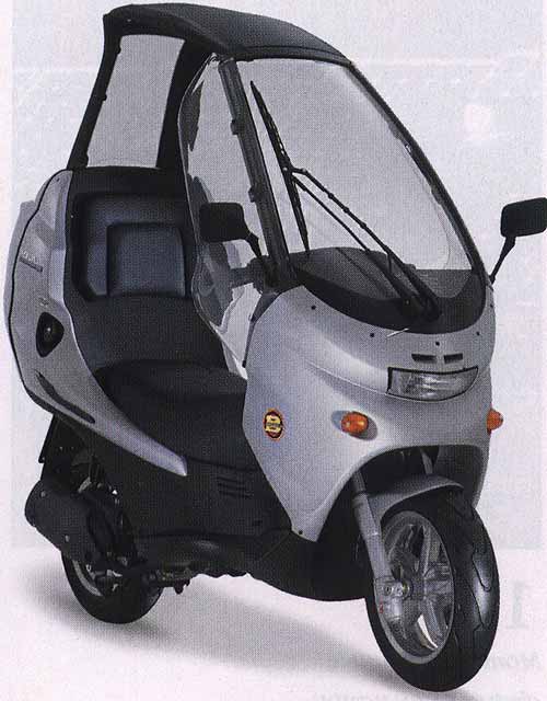 На скутерах, изначально имеющих улучшенную защиту водителя от дождя, вполне логично довести дело до конца - то есть до крыши. Такие скутеры, называемые кабиненроллерами, выпускались всегда, правда, небольшими сериями. Все-таки подъем центра тяжести, увеличение массы, парусность при боковом ветре и, конечно, неприемлемость цен, делали такие в буквальном смысле машины не очень популярными. Солидный опыт производства кабиненроллеров имеет «Хонда». Известны серийные модели Cabina и Giro Canopy. Была и экспериментальная модель со складным матерчатым «зонтиком». Модель «Бенелли» Adiva 125/150 со складной жесткой крышей (15), складывающейся в багажник, пользовалась спросом на итальянском рынке. Кроме того трехколесный скутер с крышей Scoop 50/150 выпускала компания «Италджет». Самым известный европейским кабиненроллером является БМВ С1, запущенный в серию в конце 1997 года. Имидж фирмы плюс автомобильные стандарты комфорта и безопасности сделали скутер чрезмерно дорогим, поэтому широкого распространения он не получил и его выпуск в 2004 году был прекращен."
