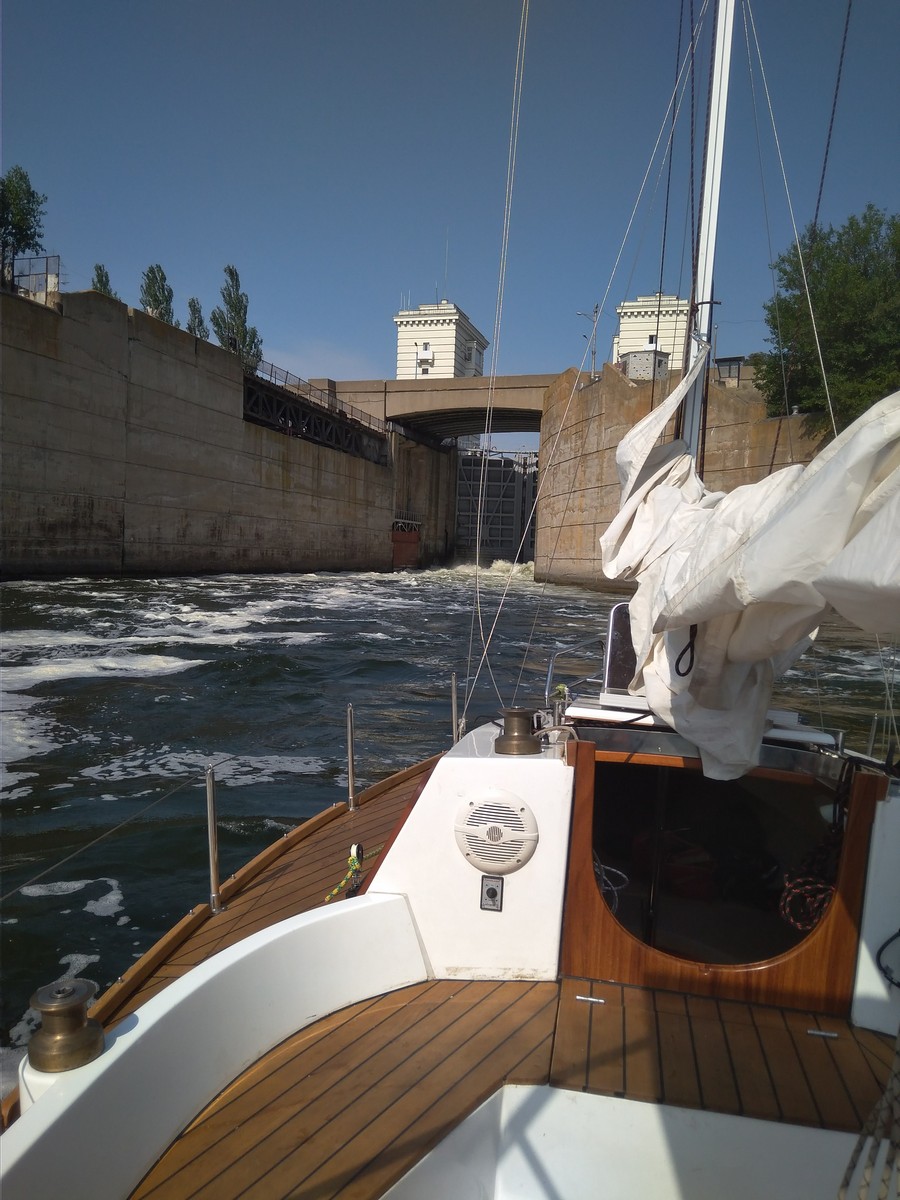 Когда перед шлюзом часть команды уехала на автобусе по своим делам (работа, дом) я понял что шлюз без мотора никак не пройти - там дует встречный ветер 15-20 м/с, а в шлюз под парусом заходить нельзя да и не реально это - очень узко для галсов. Связался с Kelly, посоветоли повторить настройку без нагрузки совсем - помогло. Радости не было предела. Мы прошли шлюз и зашли на стоянку и починку на маленький причал рядом со шлюзом наверху.