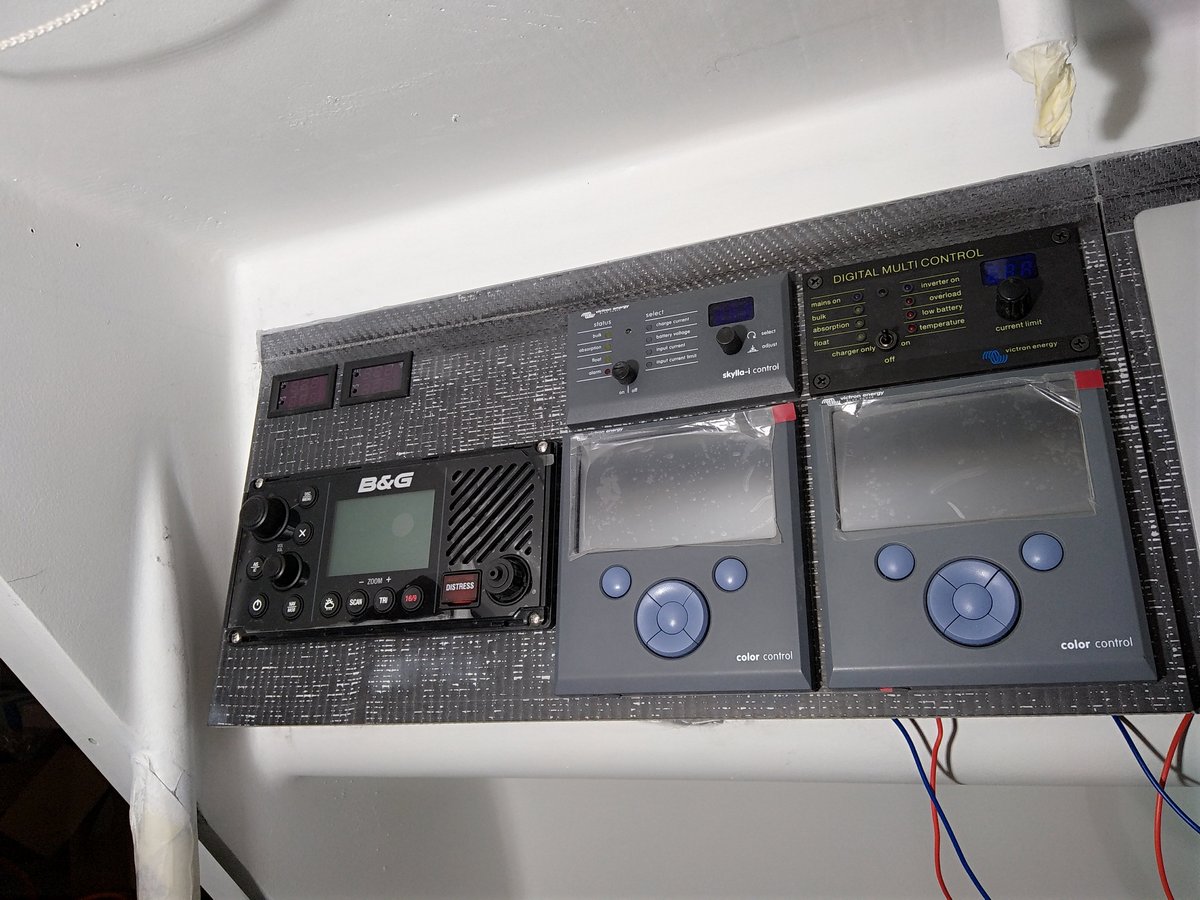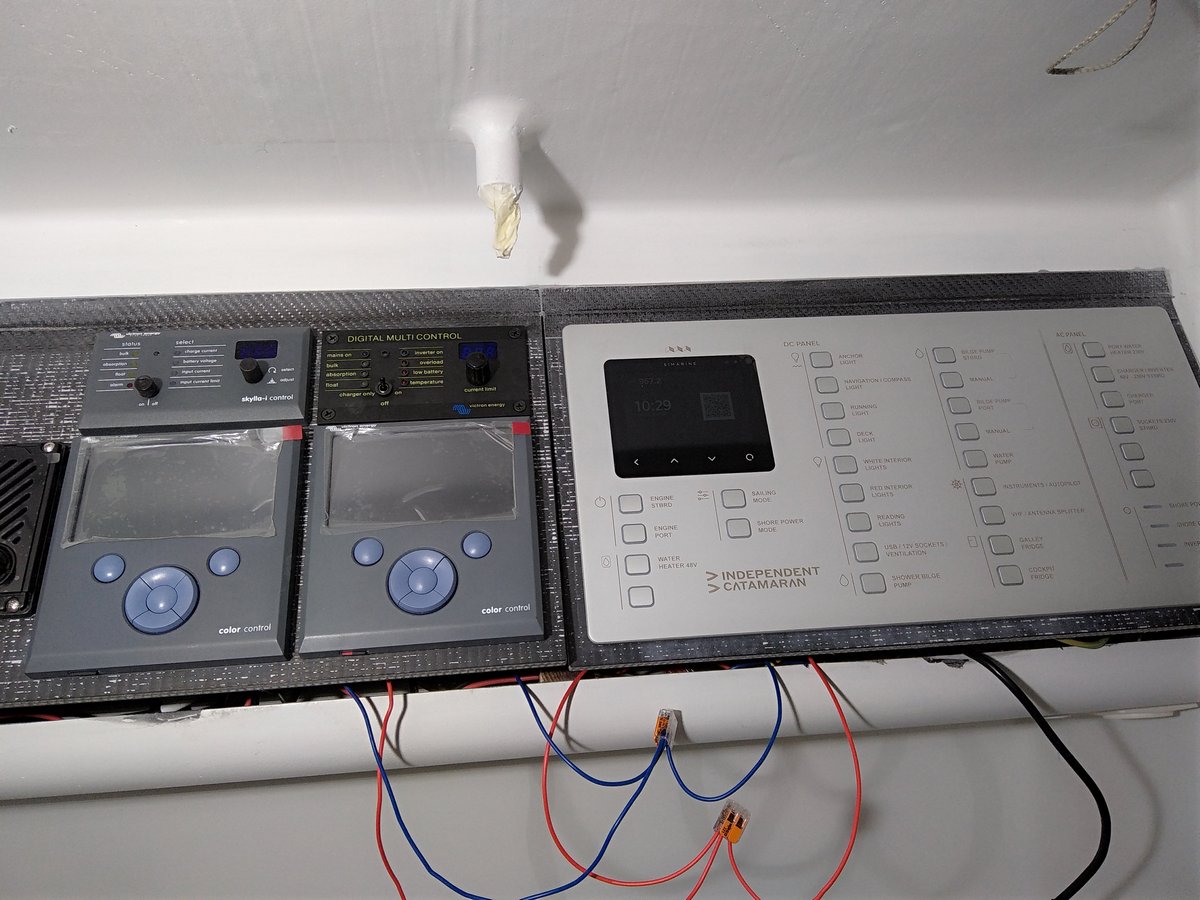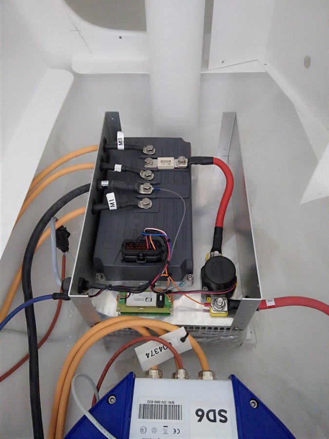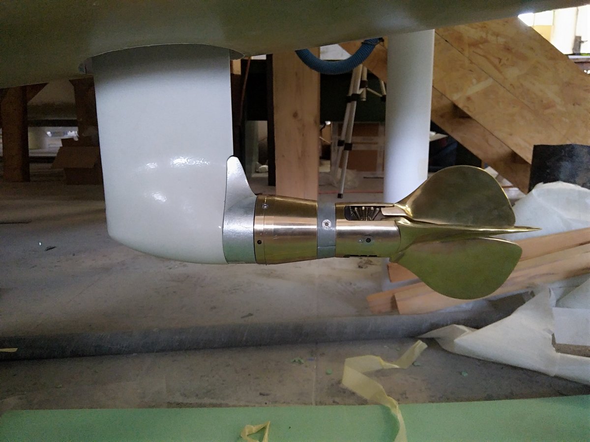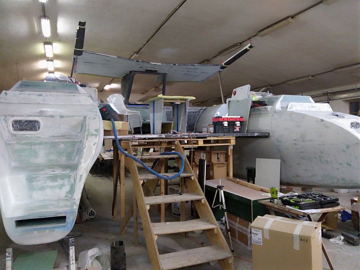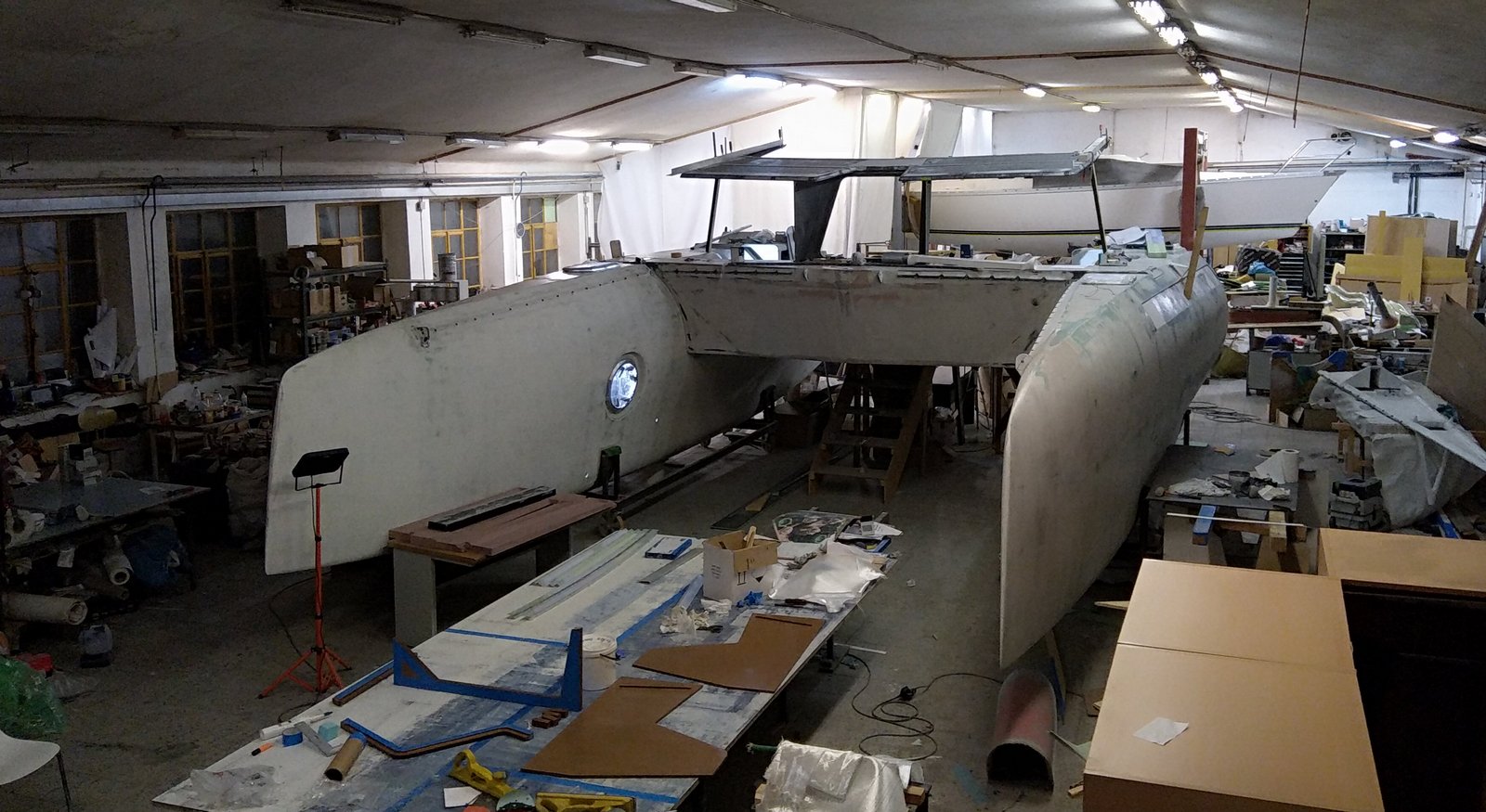 этого катамарана. Катамаран строился тут в Чехии, в маленьком городке, далеко от воды. Практически все, кто участвовал в постройке увлечённые яхтсмены, да и просто интересные люди! Сейчас лодка уже на средиземном море участвует в презентациях и заодно испытывается. Фото и видео есть на сайте и в соцсетях. Сама концепция довольно интересна- это лёгкий скоростной парусный катамаран, который кроме ветра использует только электроэнергию от солнечных батарей или из аккумуляторов. При этом он неплохо (для такого типа и размеров катамарана) обитаем. Все корпусные детали сделаны из углепластикового сэндвича, рангоут также углепластиковый, вообще всё что можно очень лёгкое. В каждом корпусе по электродвигателю Oceanvolt с угловой колонкой и складным винтом. Вообще электросистема очень сложная, практически все элементы в "яхтенном" исполнении. Моторы для своей мощности оказались непривычно тяжелыми, надеюсь что будут очень надёжными. В общем спецификации есть на сайте, а я покажу несколько фоток , которые снял пока катамаран строился.
