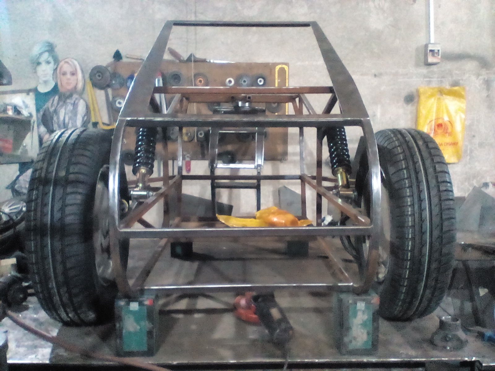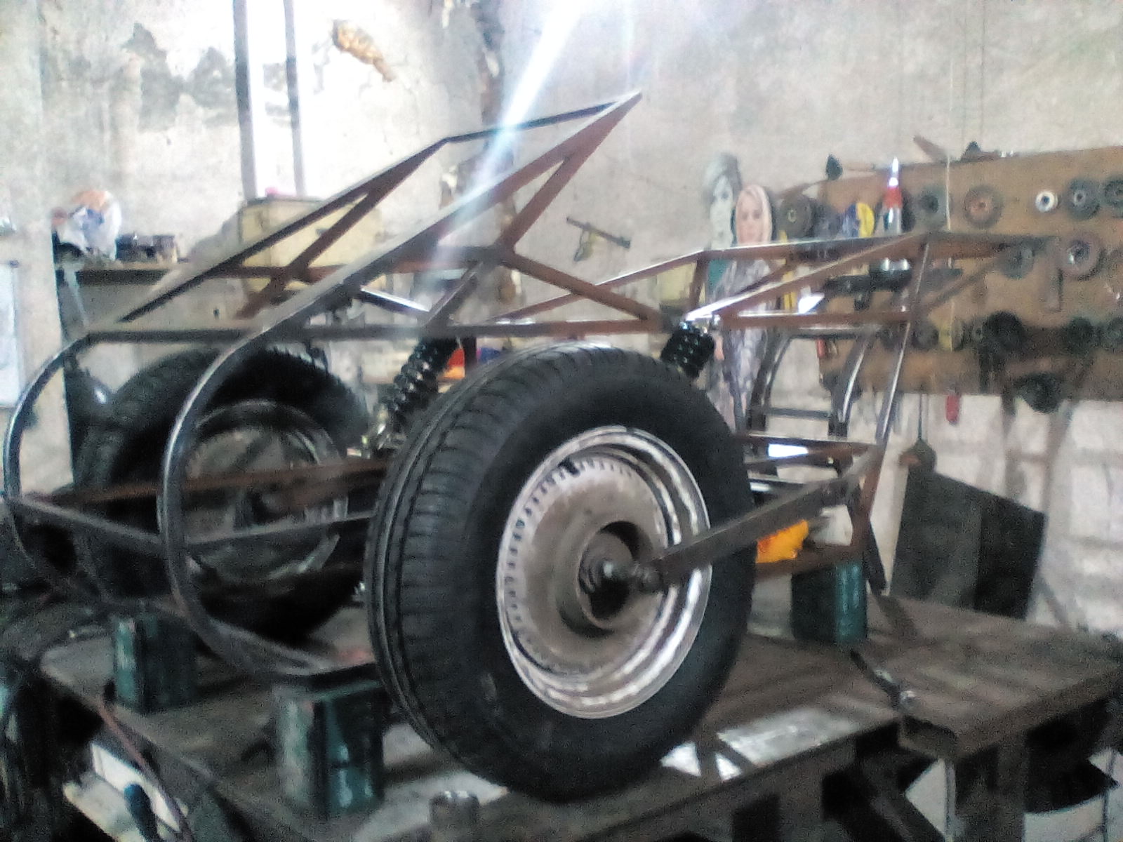 Сегодня взялись за наш Speedster. Уже установлен задний поворотный узел и маятник так как он должен стоять. Установлены передние амортизаторы, мотор-колеса обули в новую резину, впереди еще много работы...