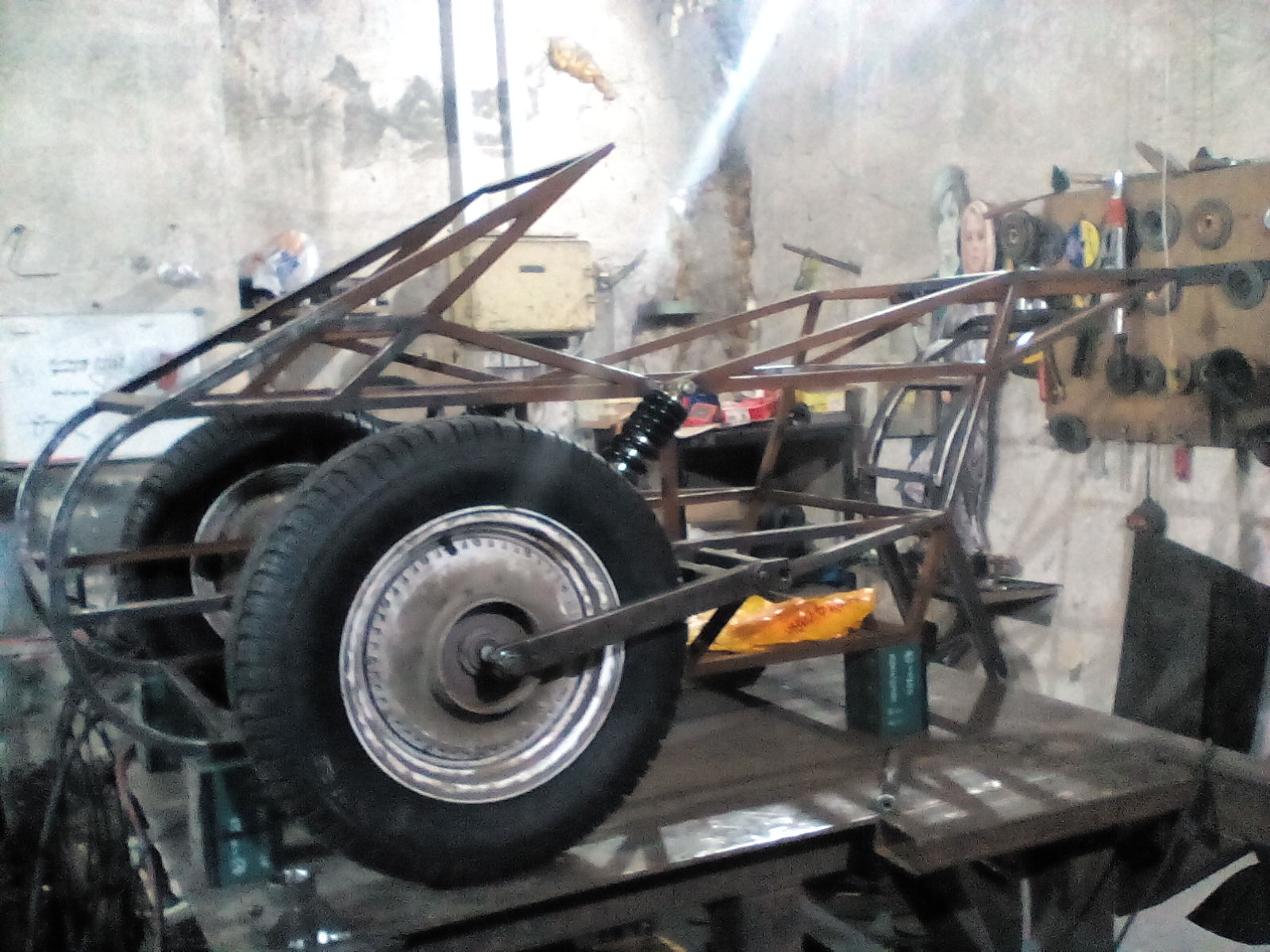 По поводу узла поворота, там еще нечего фоткать ТК его пока нет, токарные детали в работе, там просто стянуто болтом через опорный подшипник, чтоб можно было поворачивать и протестировать поведение колеса в ходу. Узел будет через неделю.Ось поворота не имеет наклона, трейла тоже нет как и у Тойоты айроад, откуда и была взята идея втч и передних маятников, так легче передок. Конструкцию разгоняли на буксире до 60 км/ч, и заднее колесо и машина вцелом стабильна как поезд, рулится легко и понятно, посторонних усилий при езде по неровной дороге колесо с узлом поворота не создают. Управлял временным тросовым рулевым, как на катере. Сейчас все детали рулевого изготавлиаются токарем, чтоб поставить уже основательно, правда делаться все это будет не раньше, чем через месяц, нас поджимают сроки с поездом.