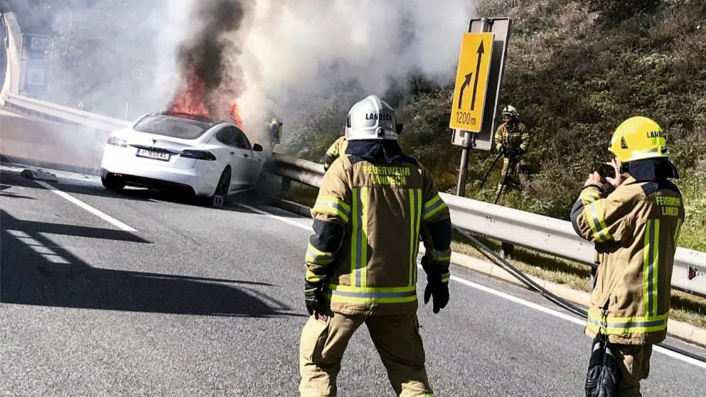 Горящая Тесла, к которой спасатели не рискуют приближаться