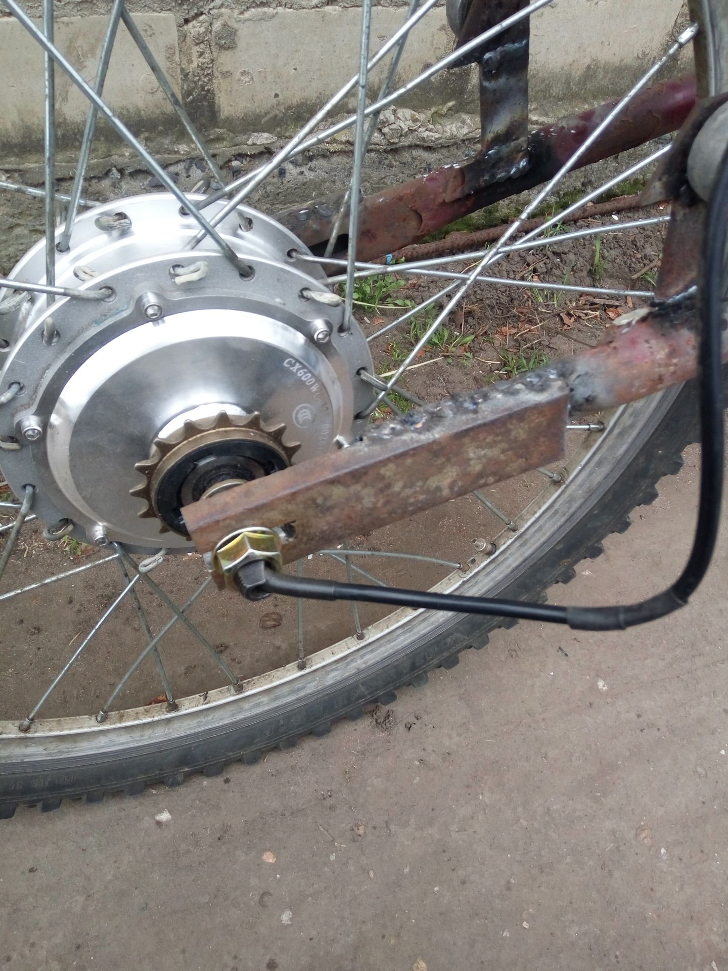 Трошки виділив часу . Таке страхіття виходить. Так як мк низькооборотисте то стоять 26 колеса. Переднє від ЗІФа з барабанними тормозами. Задній маятник доварений. Доварене кріплення амортизаторів , бо інакше колесо дістає до рами.Треба ще добавити підніжки і кріплення для акб і позрізати все лишне з рами. Спереду буде карпатовський щиток піднятий, а позаду пластиковий від вела з кріпленням до заднього маятника.