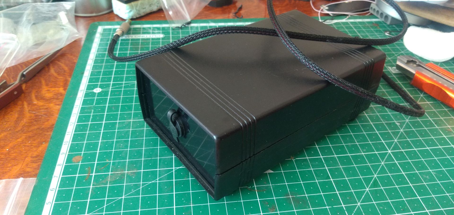 Корпус розрахований на 5S2P акумулятор з елементів 18650 або 21700. На фото саме варіант з елементами 21700. Довжина кабелю живлення порядка 1м 0,35-0,5мм кв. Вбудований вольтметр, що дуже допомогає оцінювати оперативно стан заряду акумулятора (акумулятор має BMS). Позаду гніздо для підключення зарядного пристрою на 21В для літію.