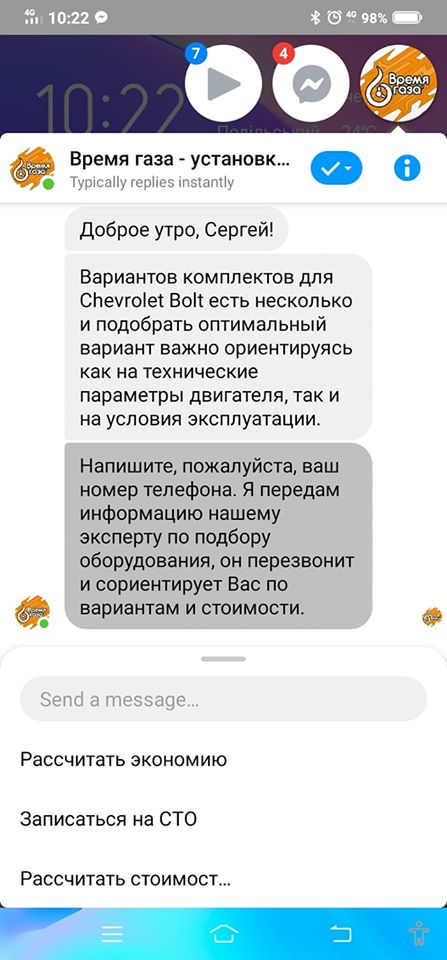 замахал меня спам в ленте на фейсбуке,решил приколоться и спросить смогут ли они на Шеви Болт газ поставить,вот получил такой ответ....