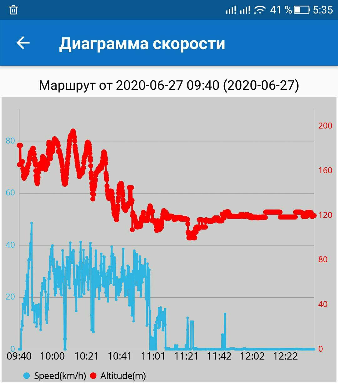 В этой поездке как и писал выше дорога не позволяла ехать быстро. Есть маршрут и диаграмма скорости и высоты. При просмотре учитывайте, что по приезду забыл выключить программу и она писала вместо 1 часа 20 минут, что мы потратили на дорогу 3 часа пока я не вспомнил и отключил программу. Средняя скорость получилась не реальная. Если сильно увеличить карту, то видно что последнее время я ходил по участку, а это все писалось и учлось в путь и разделилось на скорость. Максимальная указана я думаю правильная 48,5 км, это в самом начале пути был участок более менее дороги.