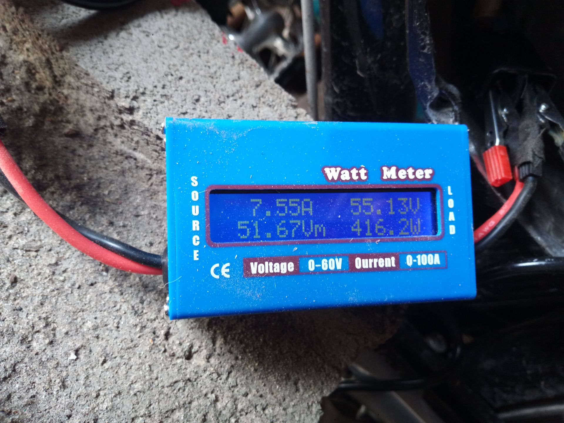 Може кому буде цікаво. Купив собі ватметра за 300 грн. Заряджав через нього свій акумулятор. Від часу останньої зарядки проїхав 73 км. БМС ще не відключила акумулятор, то ж можна було ще проїхати 5-10 км. На початку зарядки згідно показників Ватметра напруга була 51,67 V, струм на початку - 8,5 A (зарядка 8-амперна), потім струм поступово падав і в кінці був близько 7,5 А
