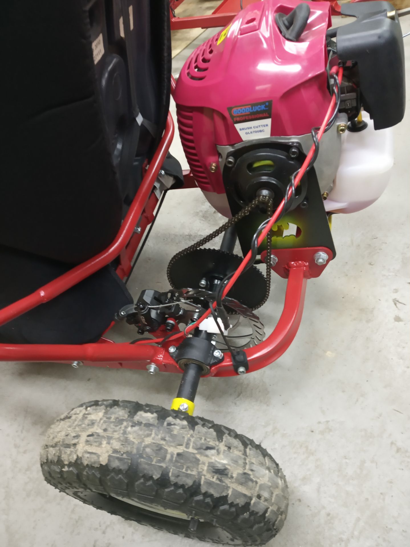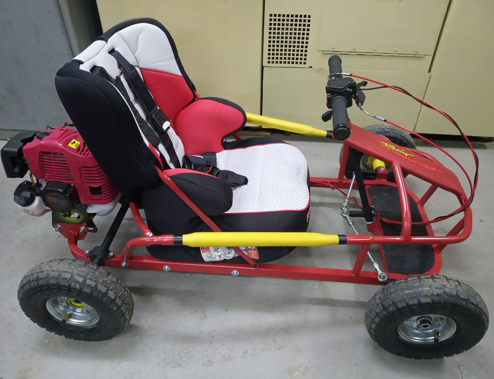 Эта рама на 100 мм длиннее . Сиденье из детского автокресла (собрано на собственной рамке с усилителями ) с трех точечным ремнем безопасности. Мотор с центробежным автоматическим сцеплением - газ нажал и поехал.