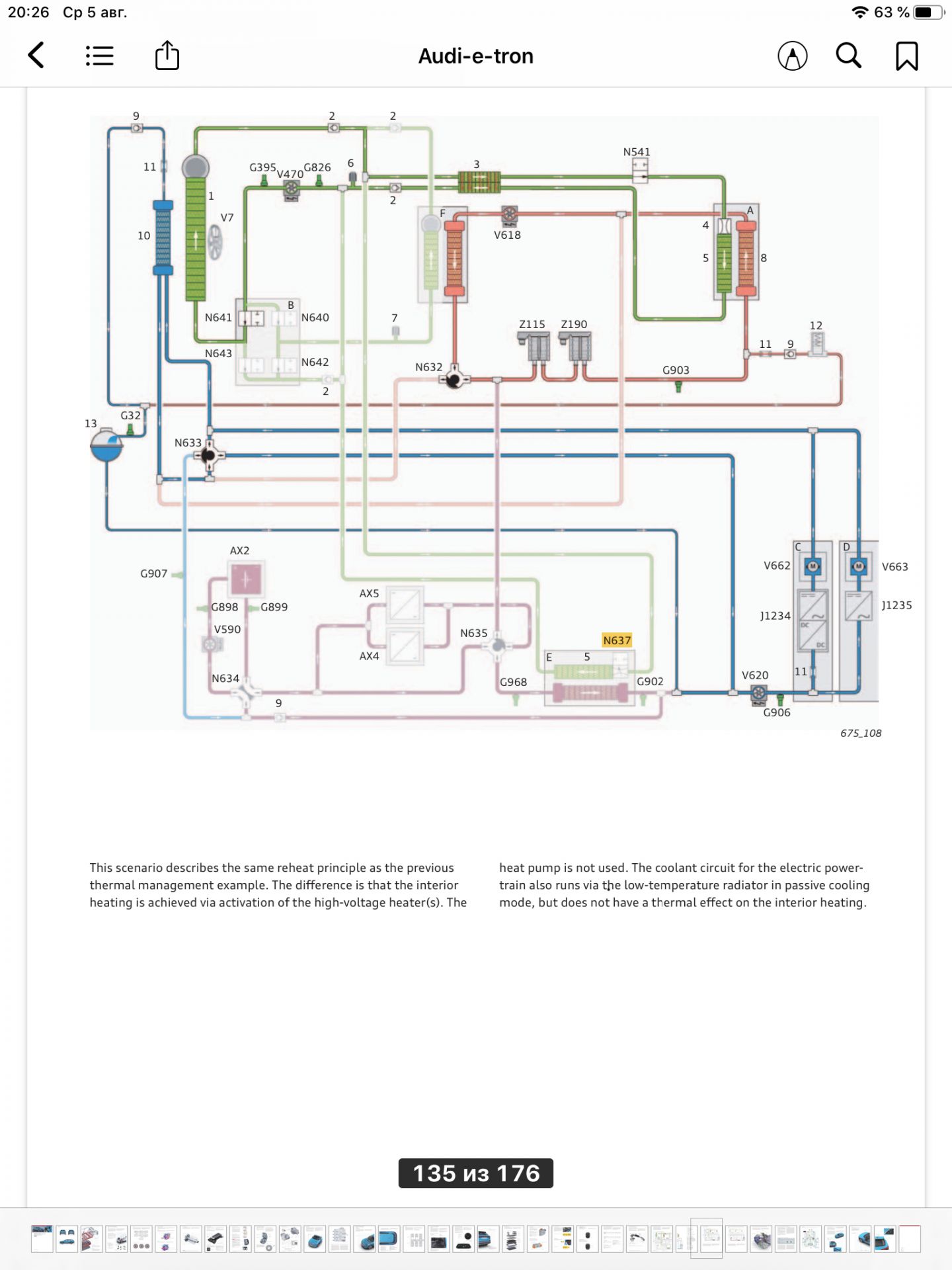 Вот одна из схем мануала е-трона с описанием одного из сценариев работы системы охлаждения-обогрева. Т.е. использование одного расширительного бачка для разных контуров (в моём случае это контур РТС-нагревателя салона и контур охлаждения контроллер-двигатель) вполне возможно и полностью оправдано.