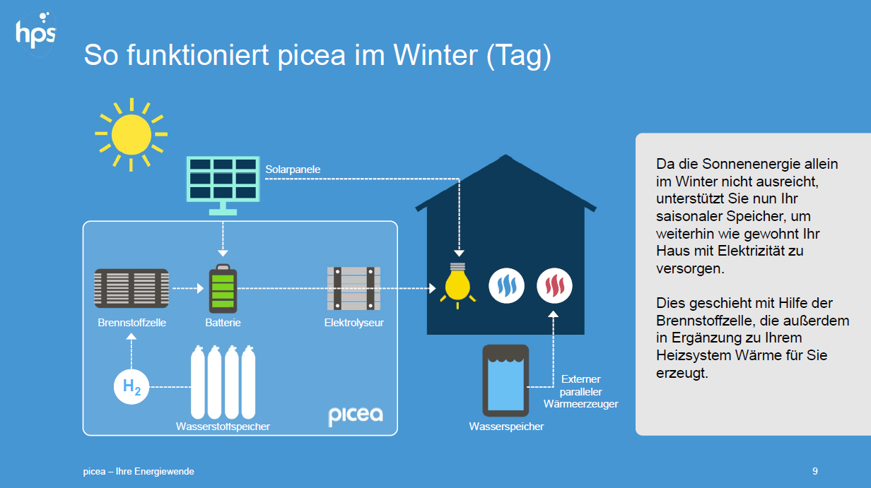 В системе имеется буферная литивая батарея энергоемкостью от 25кВтч. Но изюменкой системы являются так называемые сезонные хранилища - хранилища водорода.
