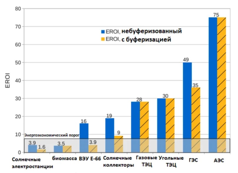 Нашел такой график, отражающий исследования европейских ученых. Произведено сравнение коэффициентов энергетической рентабельности EROI. Коэффициент показывает соотношение затрат энергии полученной от эксплуатации источника генерации к энергии, затраченной на ее создание. Буферизация подразумевает наличие рядом накопителя энергии, сглаживающего пики потребления и генерации. Минимальный коэффициент EROI для поддержания современной цивилизации равен 8.