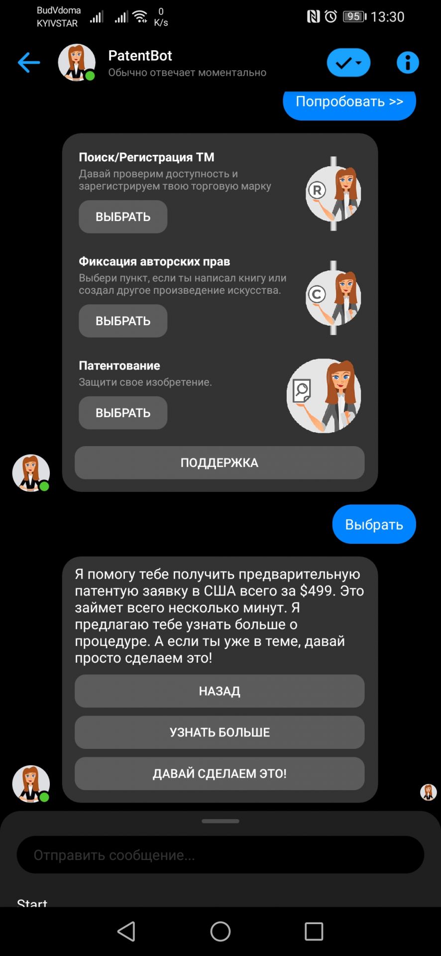 Якось , так. Патент бот , юзайте. Незабудьте иметь на карте 500у.е доя начала. Ну и потом по 500-2000у.е в месяц на адвоката который будет защищать патент )