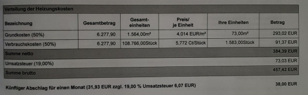 Есть общий счётчик на 2 дома, где жил.площадь составляет 1.564м². В счете я плачу половину по квадратуре, т.е. на общем счетчике 184.910кВтч тепла на сумму 12.555,80€ (если что кВтч тепла по 0,068€). Кстати эффективность двух старых домов по отоплению ~118кВтч/м²•год. У нас 73м³ и пол цены 6.277,90€ делят на общую жил.площадь и получают 4,014€/м²•год и для нас это 293,02€/год. Вторая половина по счетчику. Пол суммы 6.277,90€ делять на показание общего счётчика (я хз какие единицы он меряет, которые потом переводят в кВтч) 108.766 и получают 5,772 евроцента за 1 у.е. общего счетчика. По квартирному счётчику у нас 1.583 единицы и в сумме 91,37€. Т.е. видно, что мы потребляем в 3 раза меньше тепла чем в среднем наши соседи. Мы толком не экономим, дома всегда тепло, у нас двое детей, а младшему прошлой зимой всего пол года было. Все благодаря проклейке окон перед отопительным сезоном (спасибо 17 лет жизни в Украине), авторегулировке на отопительных батареях и утепление стен.