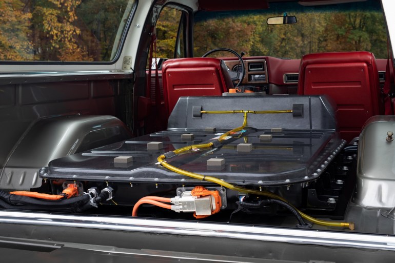...При создании Chevrolet K5 Blazer-E инженеры изъяли 6,5-литровый двигатель V8 мощностью 175 л.с., трехкскоростной автомат, топливную и выхлопную системы и установили на их место электродвигатель, батарею и другие необходимые для электромобиля компоненты. По словам создателей, порядка 90% новых систем — это заводские компоненты Chevrolet Bolt EV. В итоге внедорожник получил электродвигатель с мощностью 200 л.с. и крутящим моментом 360 Нм, а также батарею на 60 кВтч (400 В) с жидкостным охлаждением...