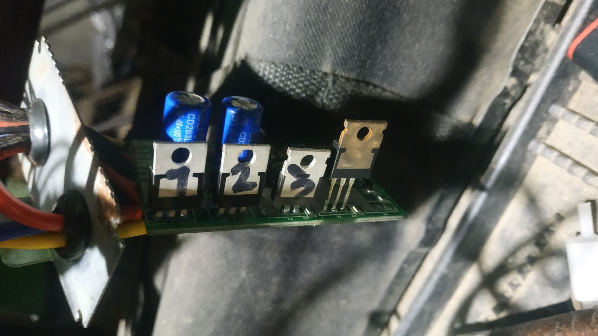 Другий пунт це проблемка з перемикачем напрямку руху. Так як новий контролер не получилося запустити вирішив глянути, що з старим. Він розібраний , при підлюченні живлення мотор стартує на повну .Оглянув а там один транзистор згорений, такого самого не знайшов установив з початку один 3710 контролер запрацював , тоді замінив і другий . Після ремонту контролера виявлено що при включенні перемикачем напрямку (буду далі як можна писати галетник) в перед колеса крутяться "на зад" (подумав не біда перекину полярність), галетник в нейтраль , пробую газку колеса все одно крутятся на зад, тільки галетник на на задній рух , колеса так само крутяться для руху на зад але в добавок виникає сильне навантаження на проводах з контролера зарядка :wallbash: , за пару секунд плавятся провода.