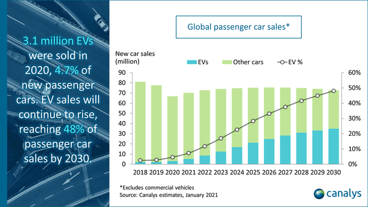 ...На электромобили приходилось почти 5% всех продаж новых автомобилей в 2020 году. По прогнозам, в 2021 году электромобили составят более 7% продаж новых автомобилей во всем мире, что означает дальнейший рост на 66% и превысит 5 млн проданных единиц.