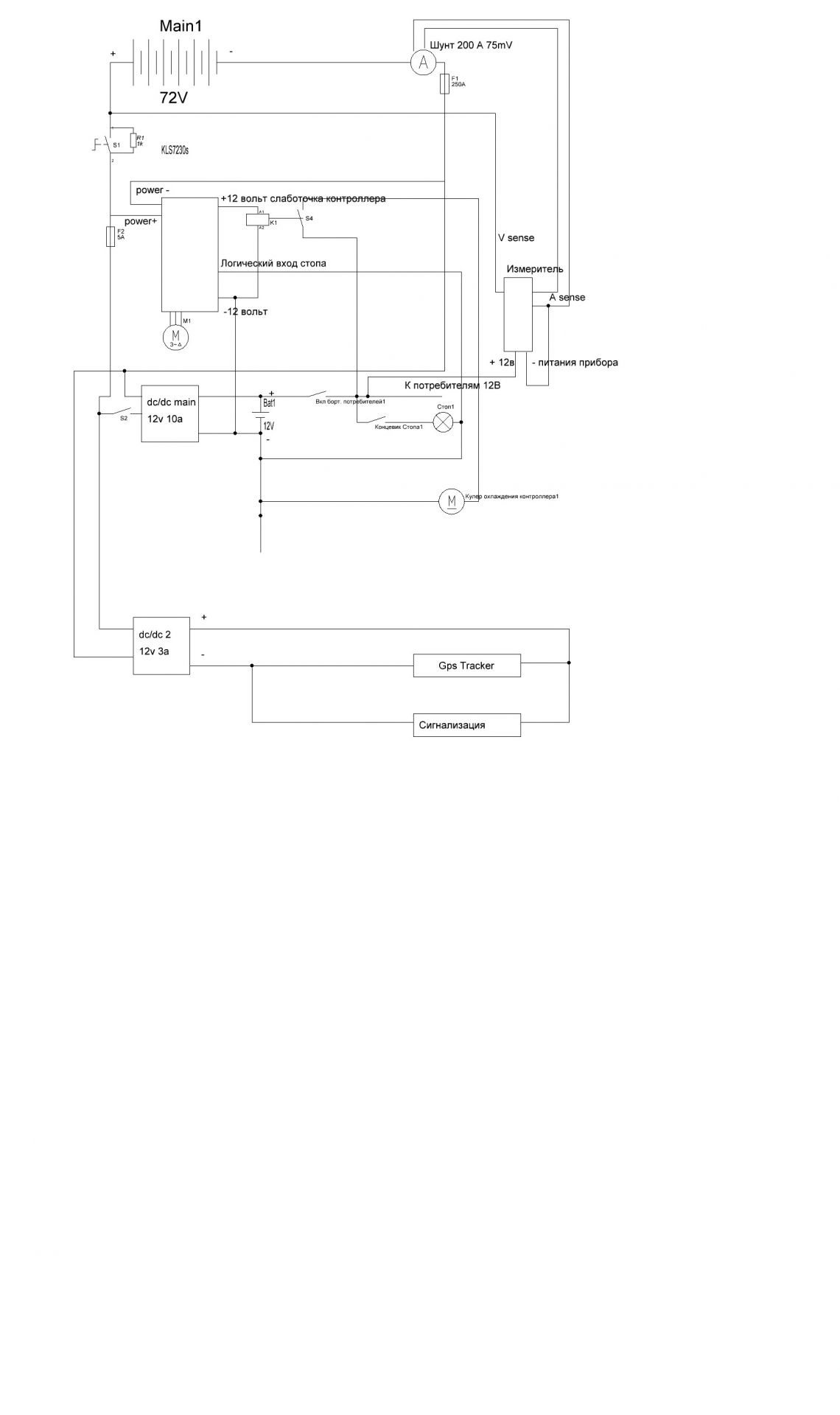 Минусы 12 вольтовой батареи и тяговой я сам специально не соединял. Но есть предположение, что они через dc-dc преобразователи или через контроллер соединились. Но проверить точно не могу. Схему нарисовал как мог, она ниже.