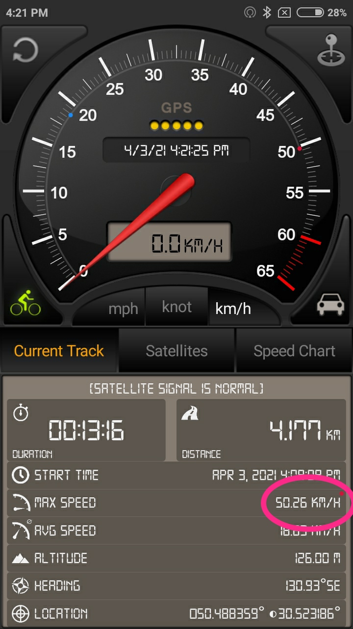 Зато сделал замер на максималку, при 52-53В (до просадки под нагрузкой), в колесах 4 атмосферы, по ровному это колесо тащит мои 86кг веса плюс 35кг байка со скоростями как на фото (первая 44, вторая 48 и третья 50 виртуальная передача соответственно). Замер по жпс. Рывков нет когда уже разогнался, токи 25+А.