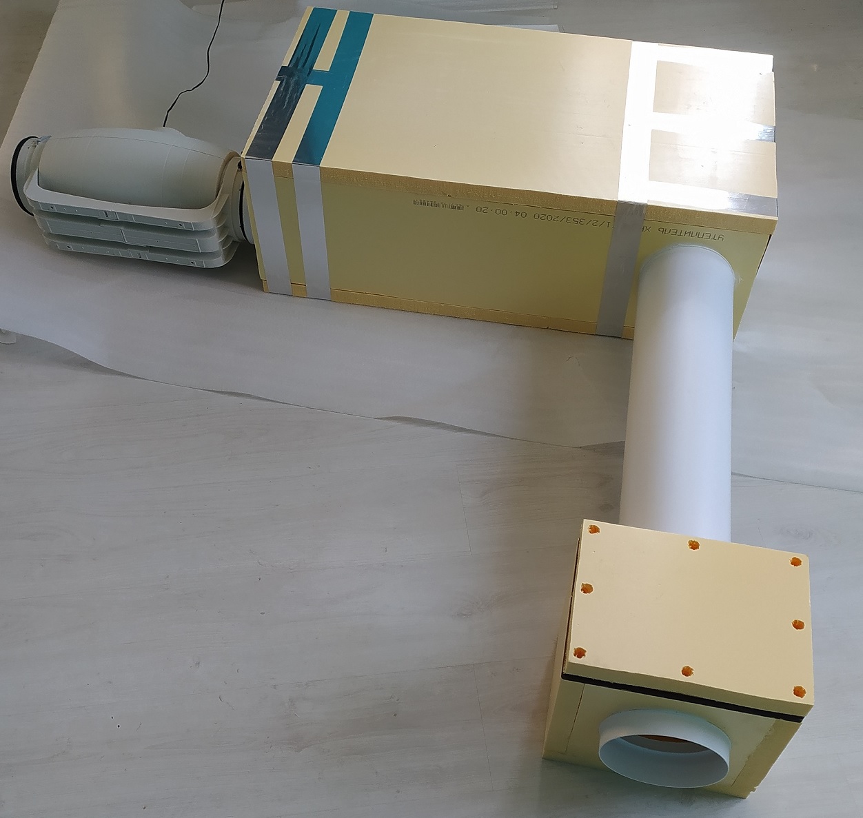Корпус из XPS пенопласта толщиной 30 мм, теплообменные ячейки из поликарбоната толщиной 4мм, их размер 300х300х250. Воздуховоды диаметром 160мм. Предусмотрен слив конденсата в дренаж.