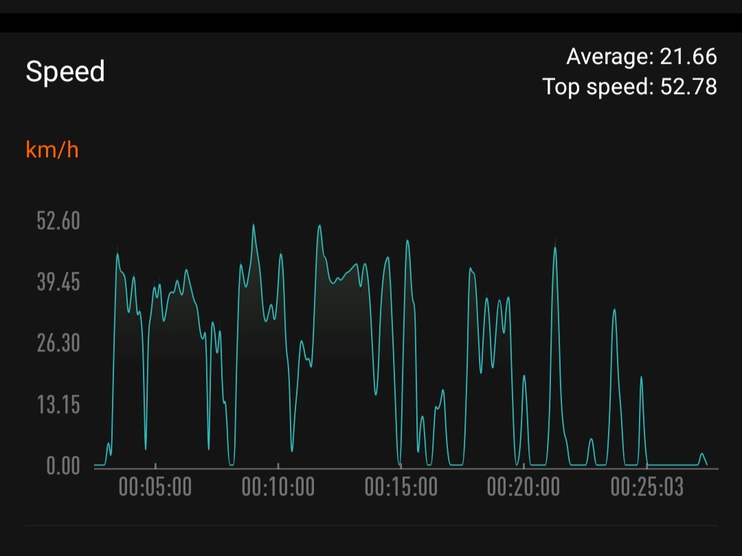 Правда после 55 км/ч разгон становится поспокойнее и у меня не нашлось по пути прямой, где можно было бы давить в пол до упора, чтоб понять может ли он больше 63 км/ч. Скорости типа 30-40 он берет легко, на 25 по ровному берет 5-6А. Когда просел до 67В, то 60 км/ч перестал разгоняться, но 55 всё ещё брал бодро. Как по мне то абсолютно избыточная скорость для велосипеда, что подтверждается средней в 21км/ч (да, по ощущениям он всё ещё велосипед - не мопед, и тем более не мотоцикл). Ваттметр не засек, но по току батка отдала где-то 5,5А/ч за 20км со всеми разгонами, буграми и максималками. Таким образом, я на этом конфиге могу проезжать 50-60км, что для меня с головой. Сколько мотор не трогал, не теплый даже, но я и не ехал на нем на стабильно большой скорости, при этом сегодня +8 едва ли, северный ветер очень сильный.