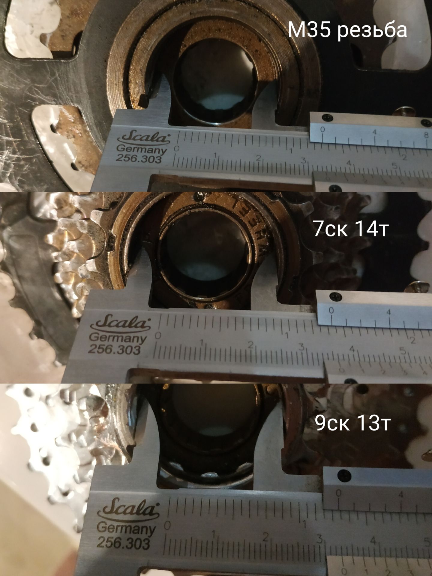 Резьба фривила 35 мм. На обычной 7ск трещетке самая малая звезда 14зубов будет иметь внутренний диаметр больше 35 и налезет на эту резьбу с вероятностью 99 из 100, с меньшим количеством зубов мне трещетки 7ск не попадались. А вот нестандартные трещетки на 9ск имеют звезду 13зубов, но она может и не налезть - тут пробовать надо, без разбора не померить внутренний диаметр, а в сборе там меньше 34, но то внутренний диаметр гайки, которой она притянута к блоку звёзд. Есть ли трещетки с ещё меньшими звездами типа 12 и 11 зубов, не в курсе, но это будет экзотика однозначно.