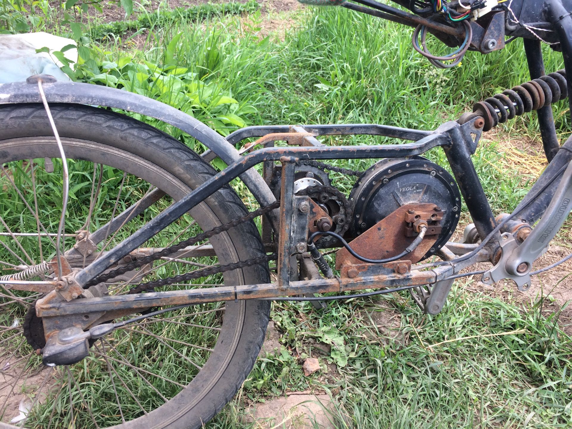 Для чого та вся заморока з переробкою редукторного моторколеса в миддрайв? Ще розумію якщо робити тракторець яким поле орати... Ті всі зайві ланки ланцюгів, зірочок тільки збільшують вагу велосипеда, та ненадійність. Додаткове тертя, розтяг ланцюгів, догляд за ними, пісок бруд... Допомагаючи педалями можна здолати любу гірку без додаткових редукцій на 350 ватному двигуні. Більші нахили гірок це вже заднє колесо пробуксовує.