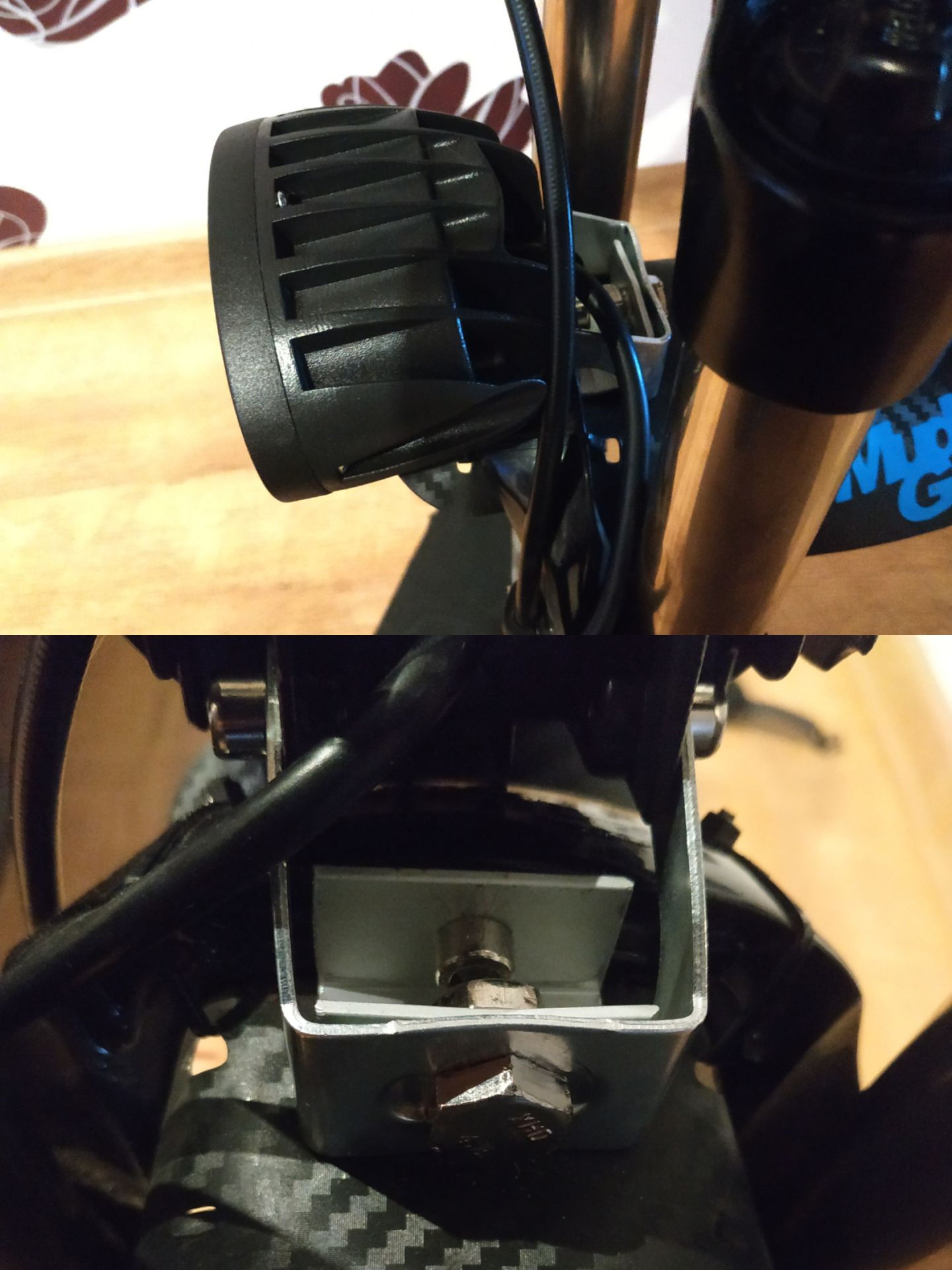По факту предварительной настройки света пришлось переделать крепление. Изначально максимально прижал фару к гориле, но в таком положении не получалось достаточно опустить вниз луч. Пришлось поднять фару. Гипотетически может встретиться с кронштейном второй фары на максимальном ходу вилки. Надеюсь до этого не дойдет или буду ещё раз переделывать.