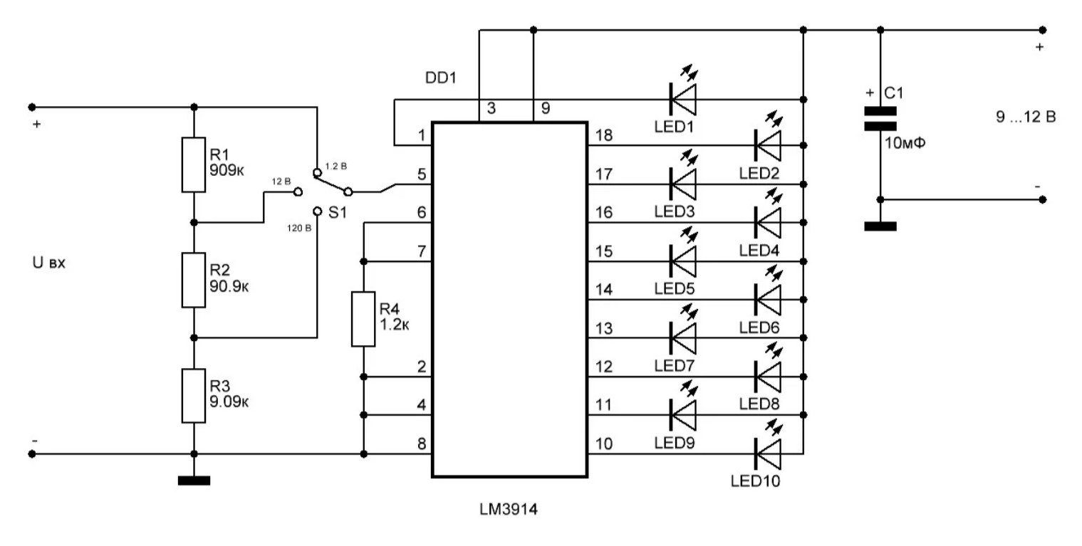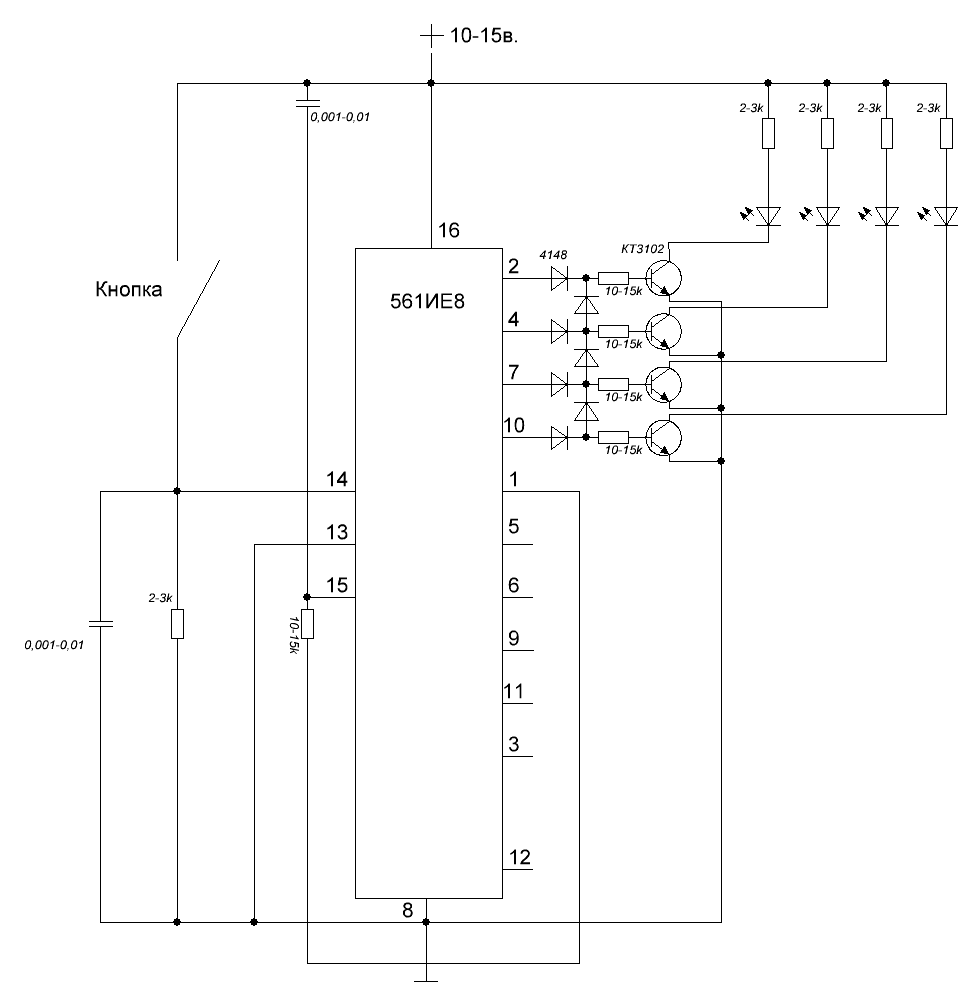 Вот вам цветомузыка на 561ИЕ8 чтобы с каждым нажатием кнопки подключался дополнительный выход, и так по кольцу, то есть загораются светики - 1, 1+2, 1+2+3, 1+2+3+4, после этого все гаснут и потом повторяется цикл.