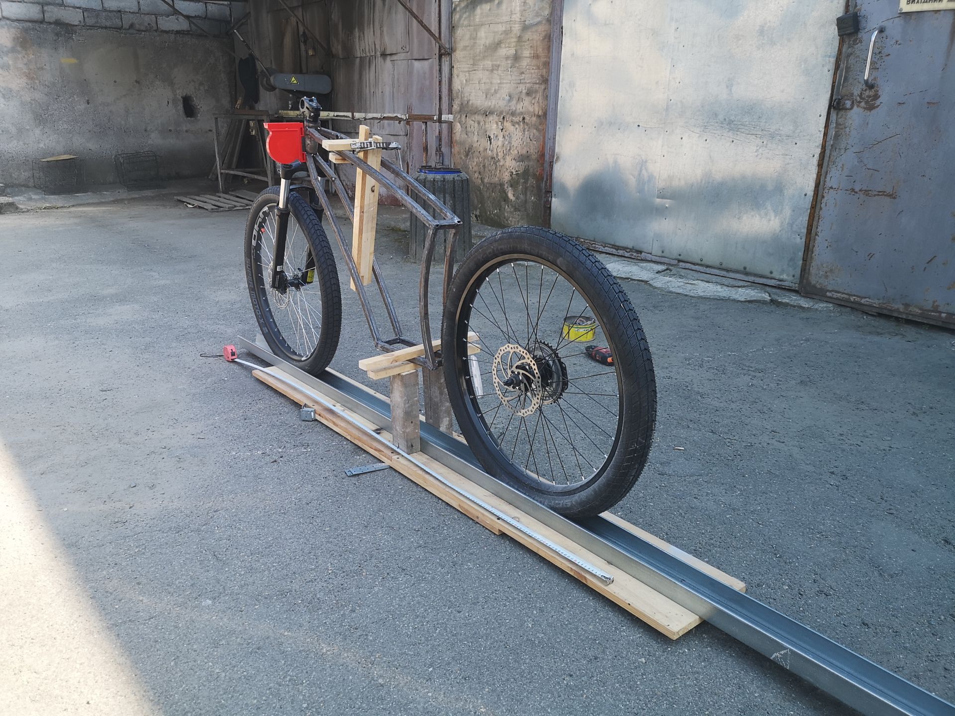 Приварили стакан, вернее пока прихватили, еще ничего не проваривалась, скорость работы в общем и так видно. Геометрия вышла чуть не такая, но я уже смирился, не хочу ничего менять, да и в целом нормально. Правда думал в 200см всей длины умещусь, но получаестся около 205. Как видно для стапеля используются самые "высокоточные" приборы, уровни и т.д. Ну угол рулевой нормальный и хорошо. Дальше будет каретка, в нее вставятся шатуны и после этого я прикину где будет мотор чтоб думать где будет маятник. Навскидку то чтоб цепь от мотора шла по центру кассеты - надо будет вырезать в раме проем, не пройдет оно так. В общем пока так