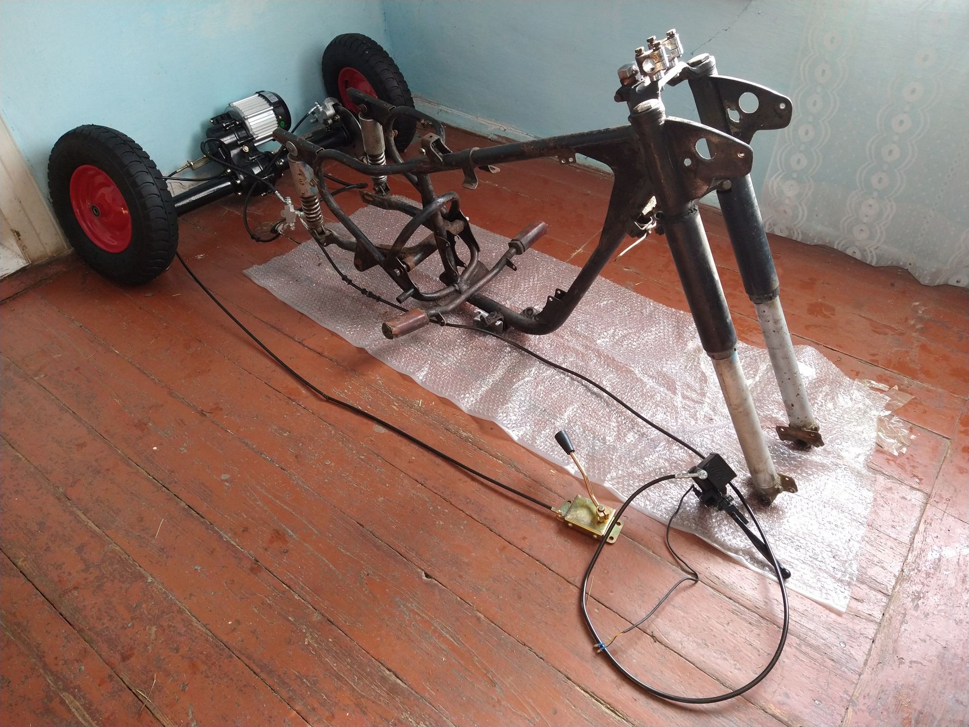 Після того, як в далекому 2016 році, було власноруч зроблено електромопед альфа, який і по сьогоднішній день радує. В голові засіла думка, зробити електричний трайк, який би виручав по господарству. Привезти мішки з картоплею, сіно і т.д. Весною на аліекспрес, замовив комплект: електричний міст - 80 см, 60В/1200Вт, контролер 48-60В, 55А, гідравлічна система двохпоршньова, тросік для вкл/викл пониженої... Хотів купити в Україні у вольти, але на той момент в наявності не було та і гальма хотілося не барабанні, а гідравлічні. Спочатку планував використати в якості донора раму від восхода 2, зробити короткий трайк з причепом. Але гідролінія, виявилася аж 2,5м, (продавець під час спілкування сказав, що гідролінія -1,5м). Тому вирішив, зробити довгий трайк з бортами. На олх, купив раму від скутера Фада 150 кубів, що послужила донором до якої приварена основна рама. Рама із профільної труби 40х40х3. Кузов із водостійкої фанери 9мм. Задня підвіска відсутня. Фазні провода з двигуна - 6мм кв. Якщо вірити опису на даний двигун, то крутний момент при 60 вольтах - 287 N.M. Випробування показали, як і було задумано на початку, що з такою шириною моста, трайк має бути коротким! Тому дана версія трайка - буде вкороченою, або все ж таки, даний міст перейде на восход 2.