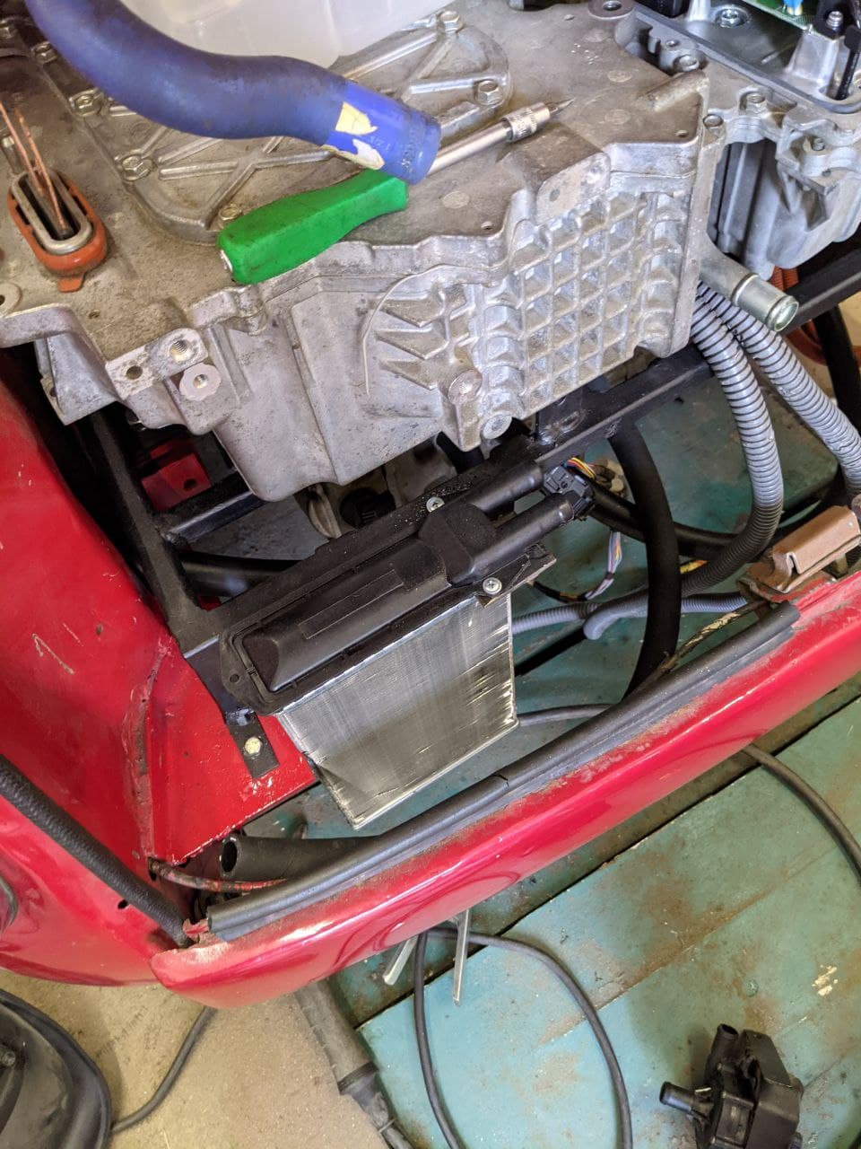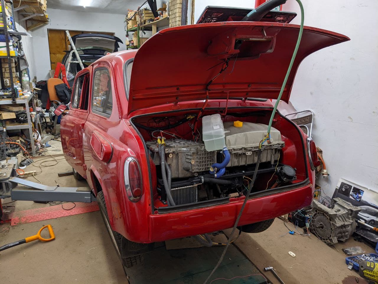 Это были первые сутки, на след день, я утром закупился шлангами, фитингами, хомутами чтоб собрать систему охлаждения силовой установки. Радиатор печки от восьмёрки, бачёк от приоры, помпа от Зои. За пол дня собрал систему охлаждения, занялся проводкой, перетянул часть проводки, что-то старое выкинул типа ПВС провода, который уже не использовался, и прокинул новые провода, выдраные с проводки зои. Ближе к ночи начал прокачивать систему охлаждения, на это ушло +- час, так как тяжело было выгнать воздух с системы, пришлось подъёмником подымать зад машины.