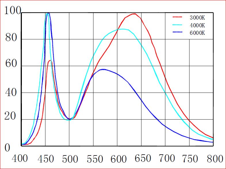 У светодиодов белый получается обычно двумя горбами, первый это сине-фиолетовый (~ 450, реальный цвет светодиода под люминофором), а второй горб это цвет люминофора(~ 600). От того насколько сильно люминофор преобразовывает сине-фиолетовый в жёлто-оранжевый и зависит итоговая температура цвета (теплый-холодный в кельвинах). График как раз показывает кривую этого преобразования.
