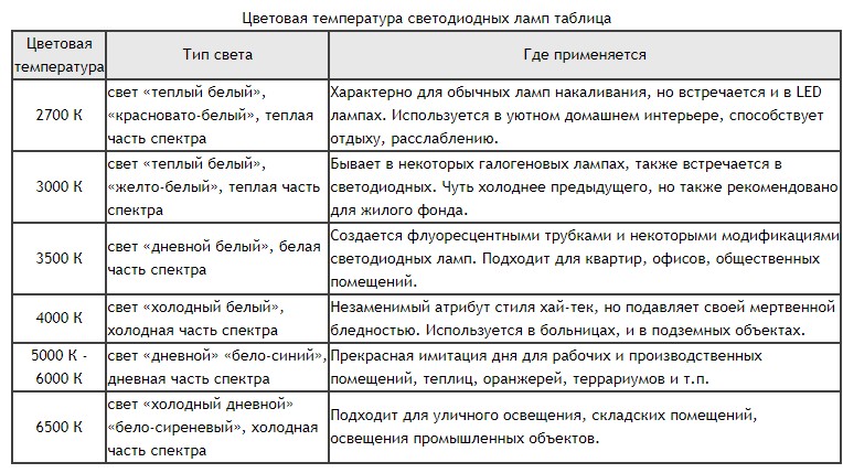 Вот табличка по температуре (цвету) светодиодных ламп по корой рекомендуется выбирать светодиодные светильники.