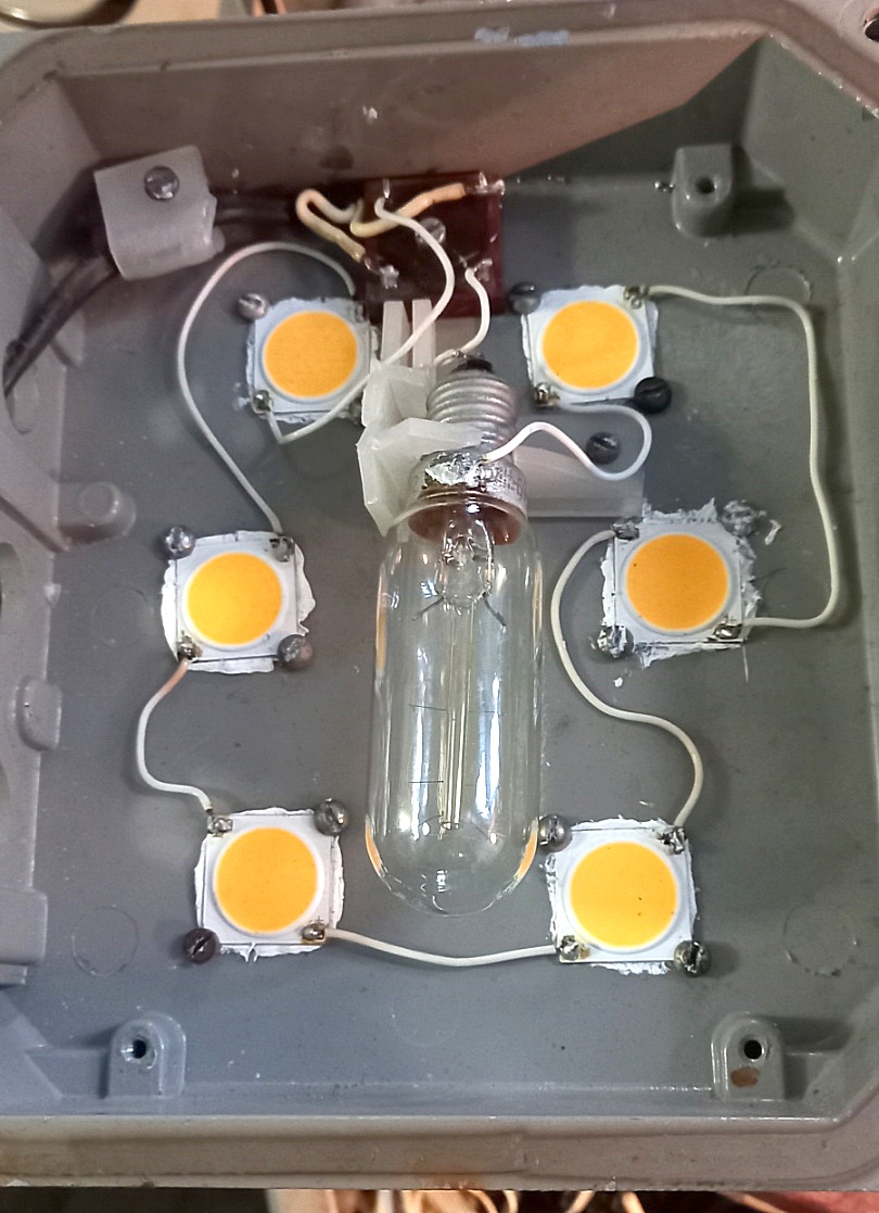 Решил из этих светодиодов сделать на работе дешманский светильник с минимумом деталей. Для светильник использовал 6 светодиодов, а из дополнительных деталей понадобились: диодный мост, и лампочка на 127в 25Вт (самая подходящая из тех что есть в наличии). В качестве корпуса и радиатора был использован силуминовый корпус от списанного прибора. В итоге вот что получилось:
