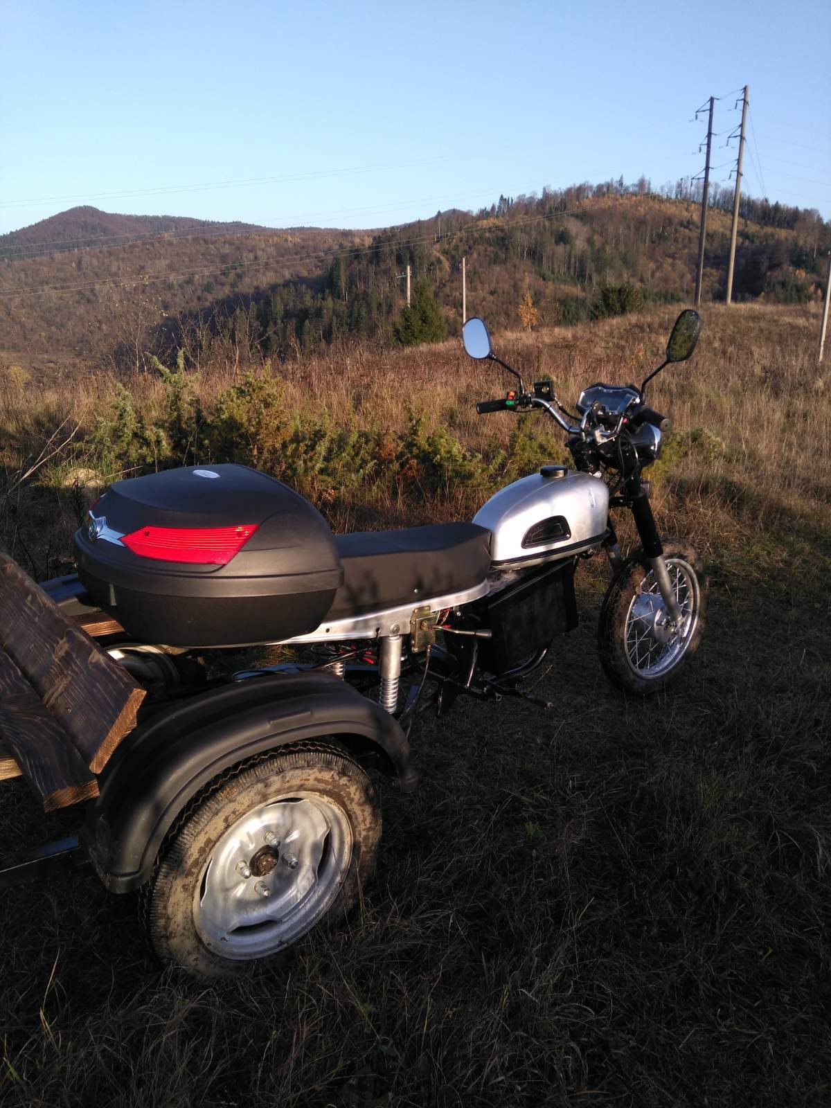 На половину зарядженому акумуляторі максималка по GPS спідометру, склала - 35 км/год. На підйомах по пагорбах, травах, дуже виручала понижена передача, але оскільки гума дорожня, то і буксував місцями. Гуму треба змінити з іншим протектором. Щодо керованості, відпрацювання амортизаторі, передніх-задніх, все чудово. Каталися по одинці і з пазажиром, все чудово. В порівнянні з вантажним трайком і цим, різниця - колосальна. Клієнт задоволений! Залишилося доробити проводку, задній багажник, установити всю світлотехніку, зараз тільки передня фара працює. Установити крила, підключити передні гальма, обшити по бокам і все. В майбутньому можливо заміниться гідравлічний шланг і трос пониженої, оскільки вони надто довгі, довелося це все зкручувати.
