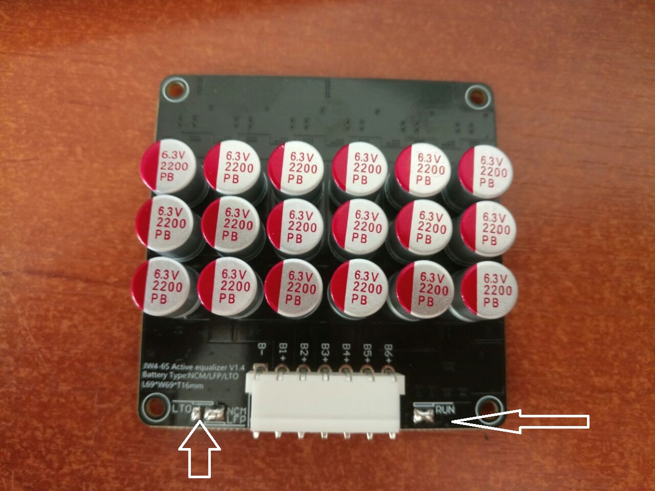 друзі, є питання. на балансирі маю дві перемички які я так розумію перемикаються для різних акумуляторів. на фото я їх позначив стрілочками. маю балансир настроїти під титанат. тобто ліву перемичку запаюю там де написано LTO, замість LFP? і ще запитання що таке RUN, і чи треба цю перемичку залишити запаяною?