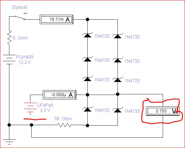 Первый скрин схемы из симулятора, на нем аккумулятор специально отключен чтобы показать верхнее напряжение которое попадает на аккум (оно настраивается путем изменения напряжения питания):