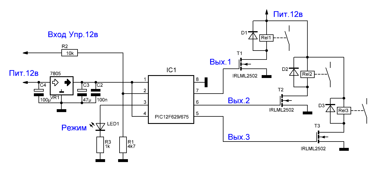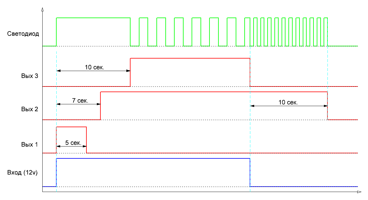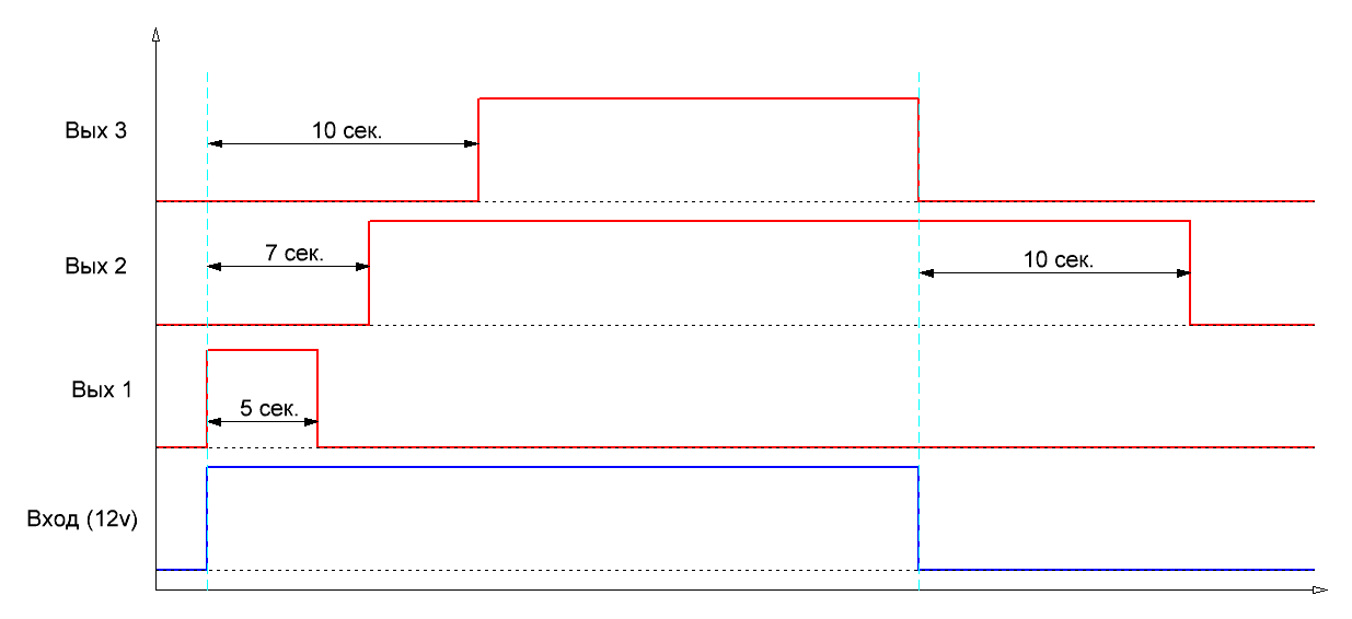 Отсчёт времени для каждого из выходов начинается с момента появления на входе командного сигнала +12В