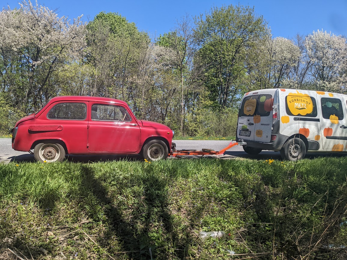 После того как Бучу и Ирпень освободили, поехал сразу на Киев, Горби остался в Франыке, потом я месяц работал в Тернополе, над проэктом электро багги, когда закончил, решил забрать Горби в Киев, так как был рядом, но проблема была в том что я на Кенге, мои все уже уехали с Франыка, в итоге я один с двумя машинами, думал взять лафет, но тогда нужно будет вернуть лафет обратно во Франык. В итоге, я придумал, заказал во Франык фаркоп на кенгу, попросил друга отправить почтой мне жесткую сцепку, поставил фаркоп на кенгу прям на асфальте на улице, Горбик на жесткую сцепку и поехал в одиночку на Киев с двумя машинами)