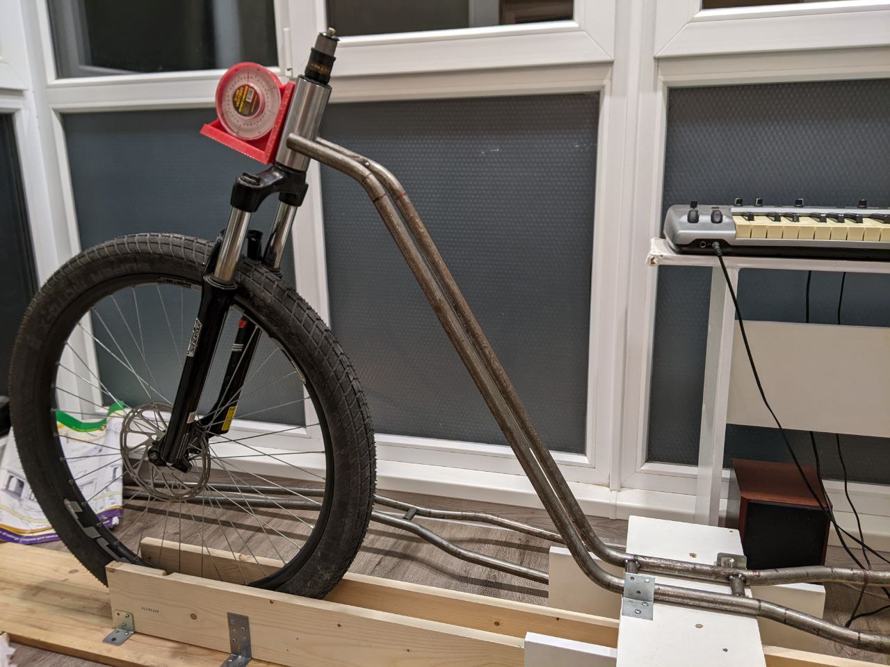 Я досі продовжую займатися рамою. Знайшов нарешті у себе в місті цех де мені зігнули труби (знайшов випадково, просто спитав на металобазі, чи є тут поряд де зігнути трубу). Там же мені і зварили труби між собою, як завжди був зроблений типу стапель з кривих досок, але мінімально свою функцію виконує. Загнули дуже добре, все чітко по моїм клесленням, а от варилось все на глаз (так як "стапель" нічого не фіксує, а просто виставляє необхідні відстані. В цілому результат мені вже подобається набагато більше ніж те що було з профільних труб, але оскільки варилось все на око, поки я просто притримував руками соосність - то звісно її там немає, рульовий стакан та нижні труби вийшли добре, а от верхні йдуть просто вбік, надіюсь поправлю це, перемички ще на варились тому ще можна буде десь підрізати та десь молотком виправити. Але найбільша помилка була з дропаутами, я їх замовив дуже маленькі (вирішив чомусь зекономити вагу) короче їх точно прийдеться вирізати і замовляти та приварювати нові
