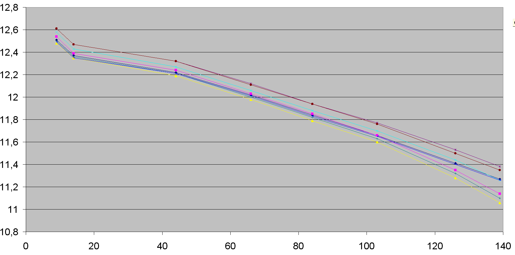 И графики дисбаланса напряжений каждого аккумулятора от среднего напряжения. Если бы батарея было идеальна сбалансирована, то все 8 линий графика слились бы в прямую по оси абсцисс (иксов). То есть напряжение на каждом аккумуляторе равнялось бы среднему напряжению по всей батареи. А так мы видим, что аккумулятор с минимальной ёмкостью (110Ач, синяя линия) во время движения просаживался вниз, а во время зарядки вылазил вверх. Что практически подтвердило убивание самого слабого аккумулятора в последовательной цепочке.
