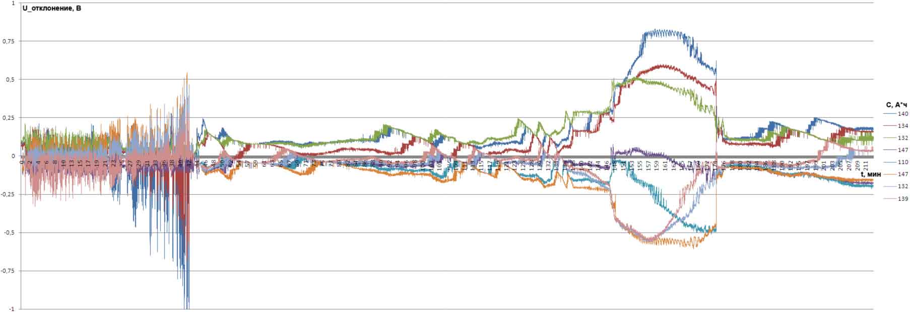 Запись напряжения проводилась на каждом из 8 аккумуляторе.
