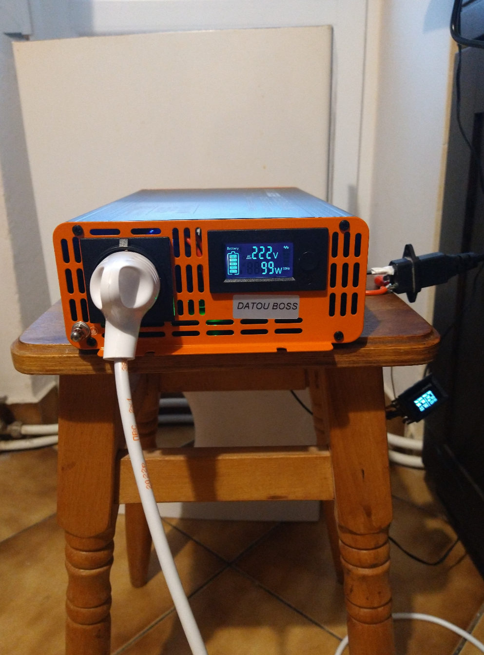По паспорту пікова потужність 1600Вт і довготривала 600Вт. Але судячи із трансформатора ват 300. Напруга 12В, але не вказано. Один крокодил був не припаяний, довелось паяти. Провода алюміній. Через декілька днів один інвертор перестав запускатись. Розібрав, пропаяв всі контакти позаду плати і все запрацювало. Струм ХХ 0,8А. Вентилятор гуде як ракета, в одному понизив напругу двома діодами послідовно на 1,5-1,8В. В іншому впаяв DC-DC міні 360 десь на 9,2В виставив. Якщо сильно не грузити, то охолодження має вистачити. Один інвертор прийшов мертвий. Вияснилось плата мертва, потрібно ремонтувати. Китаєць морозиться, відкрив діспут. Котел працює без проблем. Навантажую максимум 250Вт, а за звичай лише інтернет 40Вт і періодами котел 80Вт. Можливо ще декілька ламп освітлення 10-20Вт. Буває за добу лише 2 години світло є, доводиться розтягувати задоволення. Нижня межа відключення 10,2В, що для свинцю смерть. Для моїх лужних акумуляторів саме те. Верхня межа також є десь 15В.